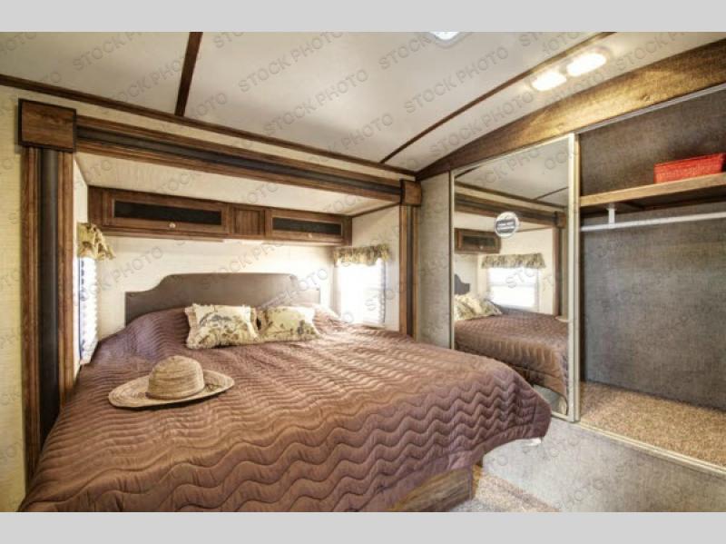 Just outside the bathroom door in the front find a private master bedroom with sliding door. The king bed slides out from the road side wall and includes overhead storage for your things. There is also a full front wardrobe with sliding doors, plus more storage opposite the bed with overhead cabinets as well.