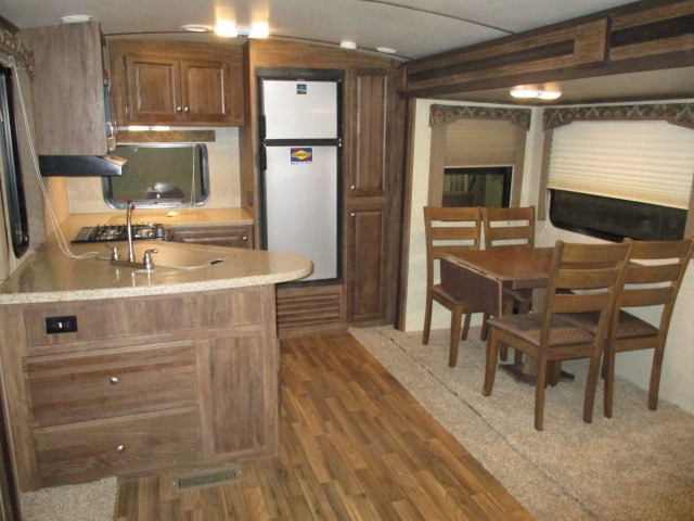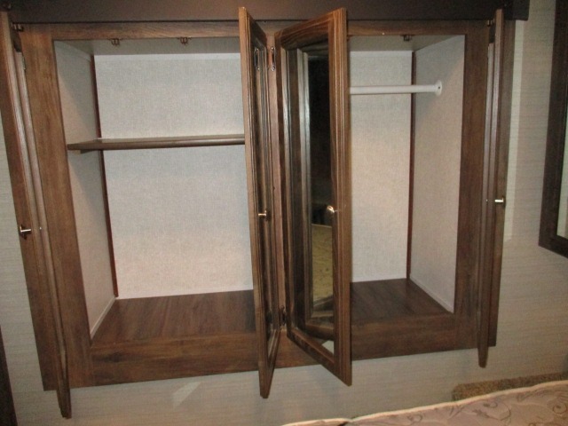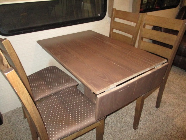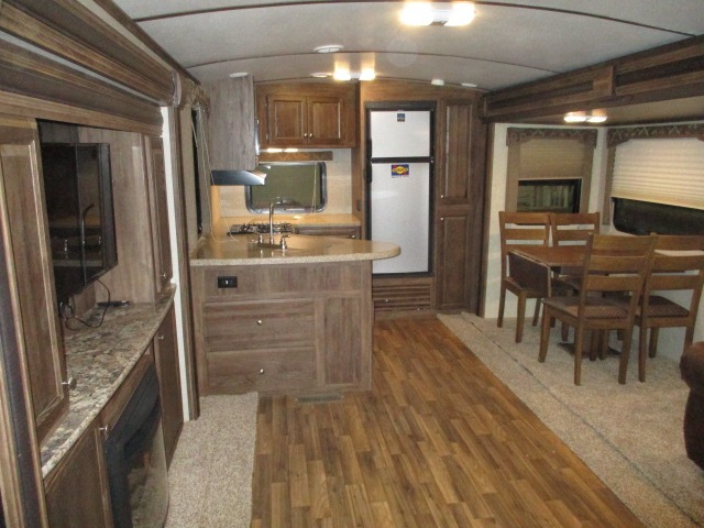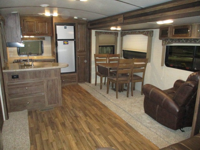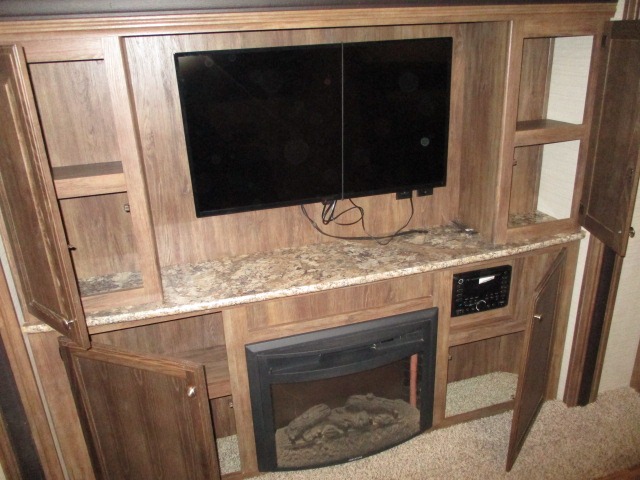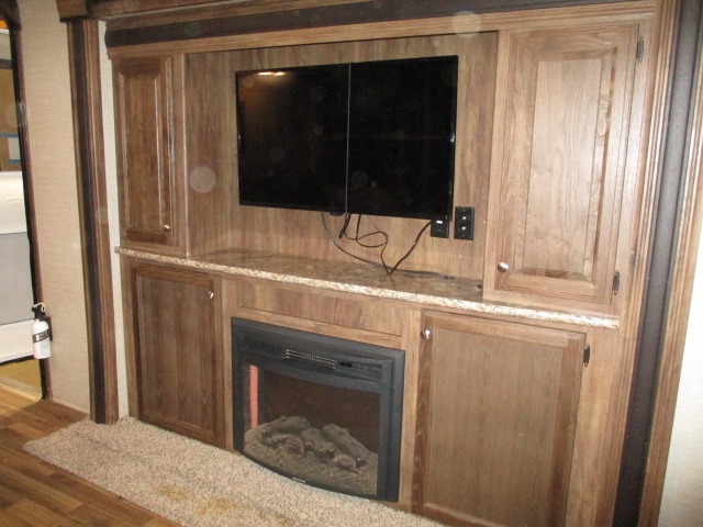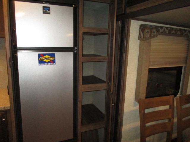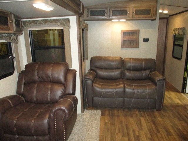Step inside 33MLS to your left to find an entertainment center within a slide out. On the opposite side there is a slide featuring a free-standing dinette, and theater seating with overhead cabinets, or you can choose an optional booth dinette and recliners. Next to the slide there is a tri-fold sleeper sofa with additional storage above.