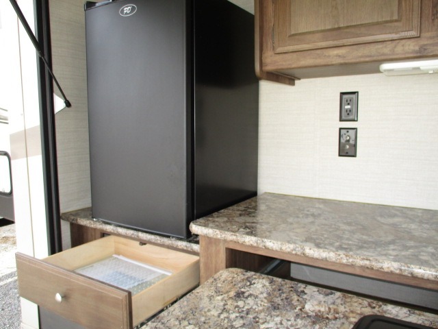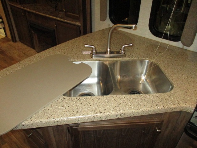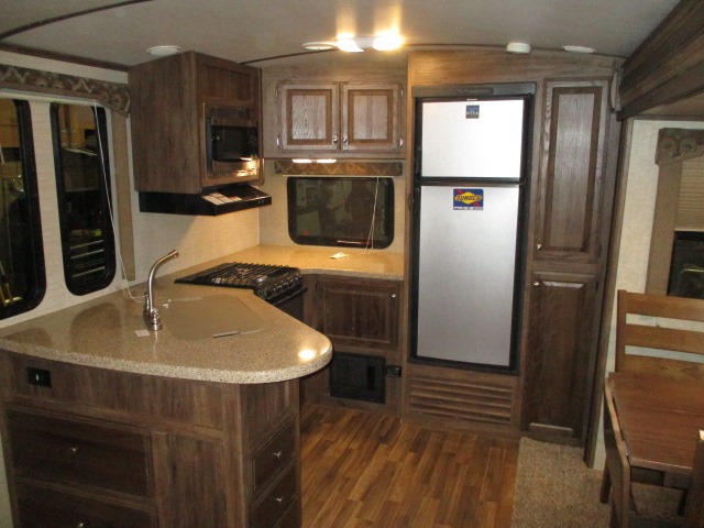 The kitchen amenities begin along the curb side wall next to the entertainment center slide. The angled countertop includes a double kitchen sink, three burner range, and corner counter space. The counter continues along the rear wall until reaching the refrigerator and pantry. There are plenty of overhead cabinets and cupboards below for storing all your cooking camp items.
