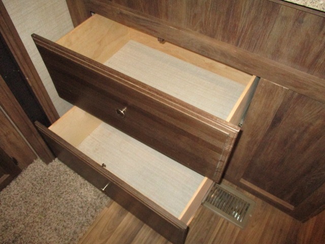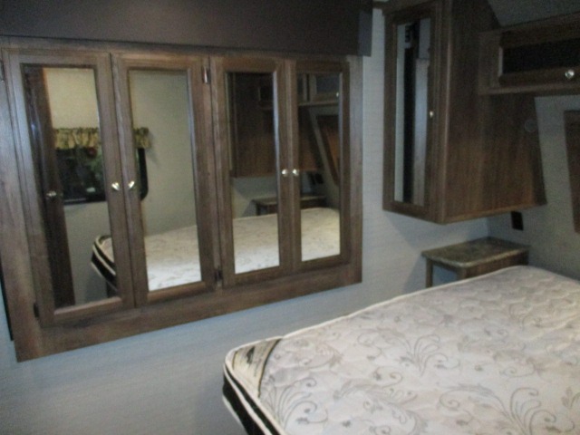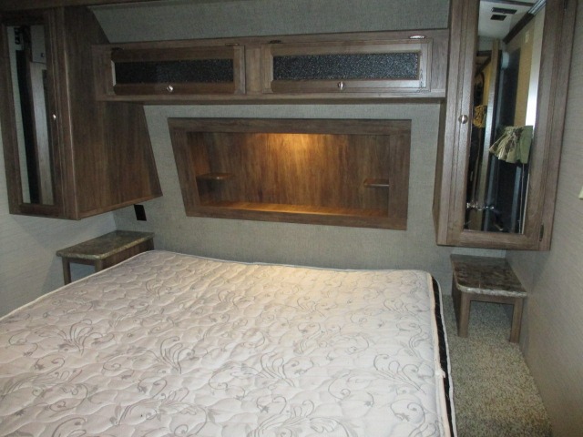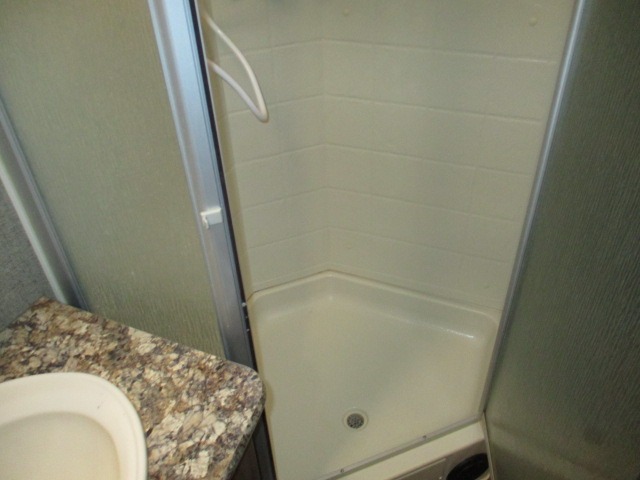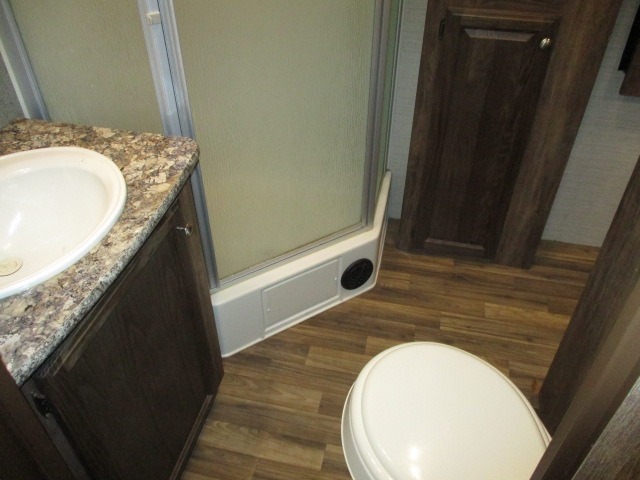 If you are looking for the restroom then head towards the front of the trailer. The side isle bath includes a neo-angled shower, sink, toilet, and linen cabinet, plus a second entry into the bath from the bedroom.