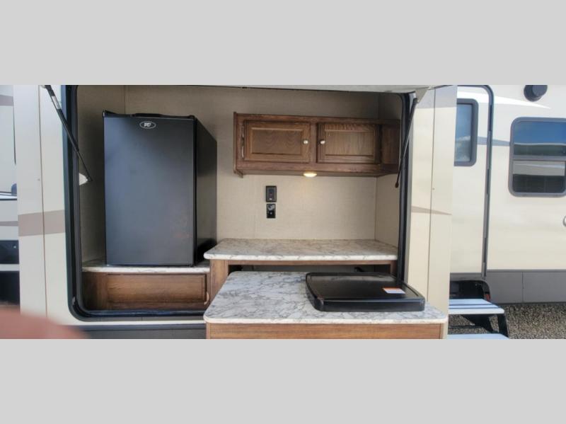 There are many features inside to enjoy and plenty outside. The exterior kitchen provides a refrigerator, two burner cook-top, and a sink. When unloading and loading your outdoor gear, the pass-through compartment near the front and the exterior storage near the rear come in handy.
