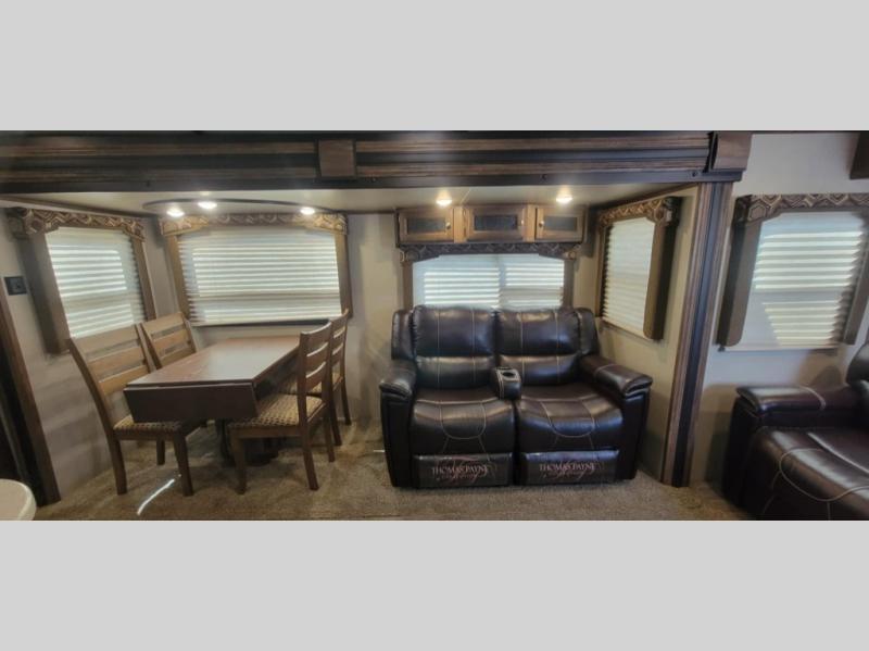 Step inside 33MLS to your left to find an entertainment center within a slide out. On the opposite side there is a slide featuring a free-standing dinette, and theater seating with overhead cabinets, or you can choose an optional booth dinette and recliners. Next to the slide there is a tri-fold sleeper sofa with additional storage above.