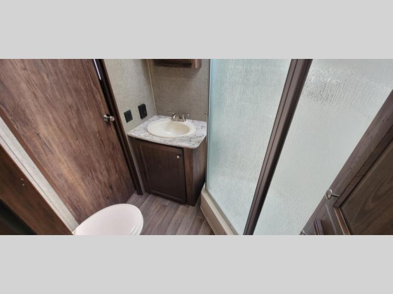 If you are looking for the restroom then head towards the front of the trailer. The side isle bath includes a neo-angled shower, sink, toilet, and linen cabinet, plus a second entry into the bath from the bedroom.