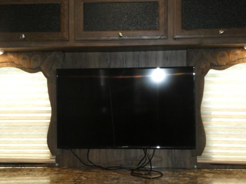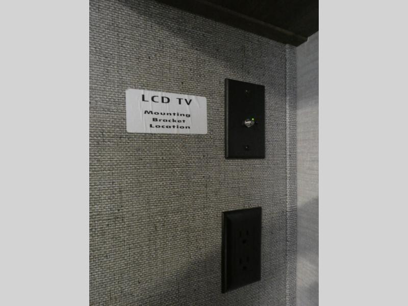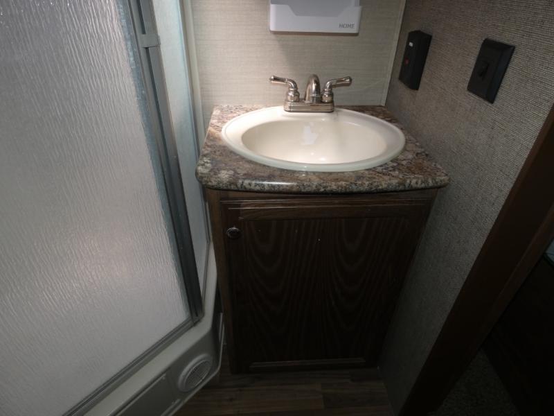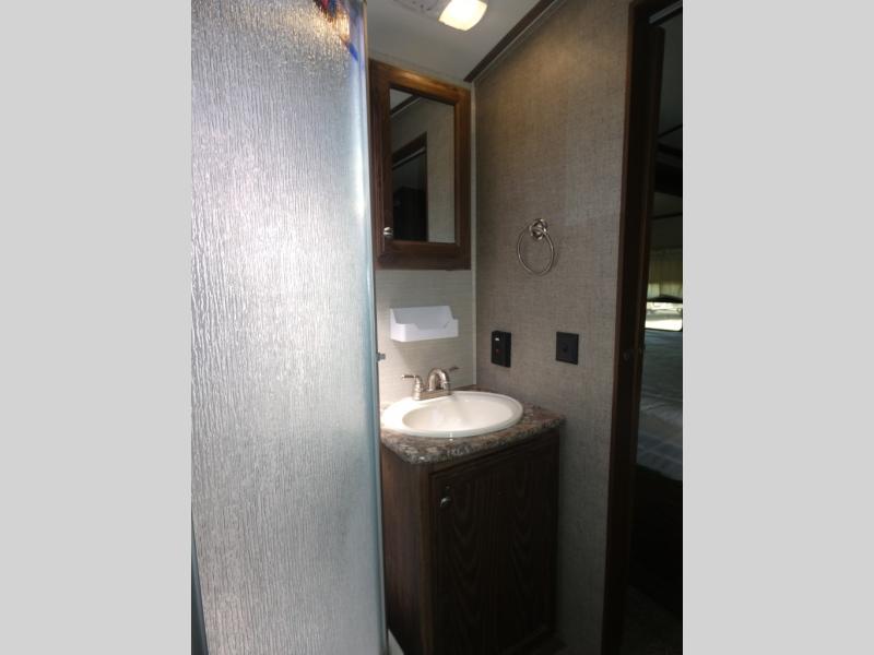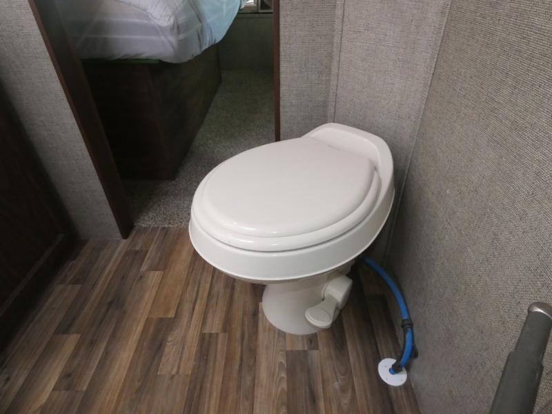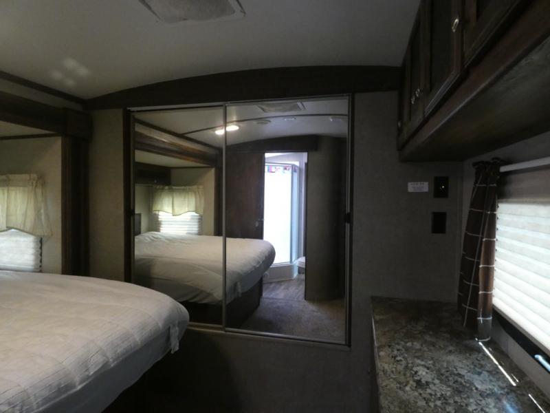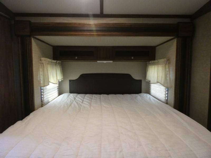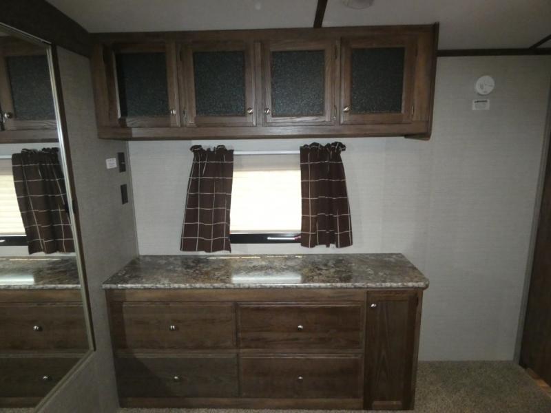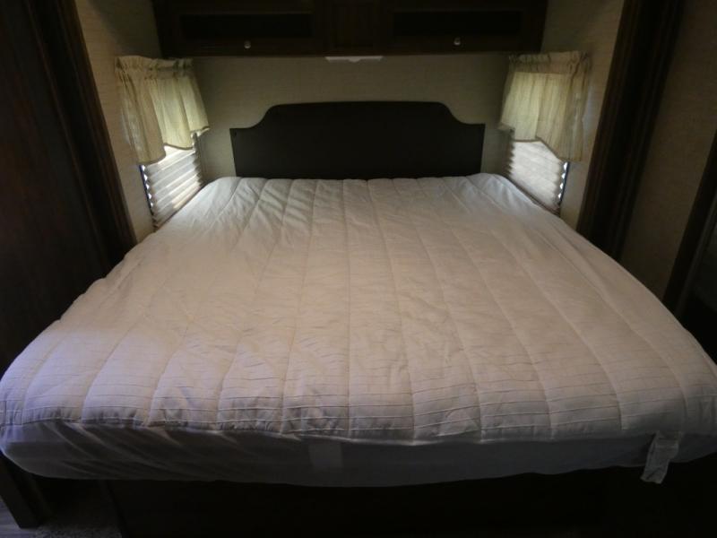 Back up front beyond the complete bath is the master bedroom where you will enjoy a relaxing night's rest. There is a slide out king size bed creating more foot traffic space to move around. You will also find plenty of storage with a full front wall wardrobe and a dresser opposite the bed with storage above, plus so much more!