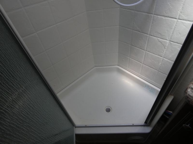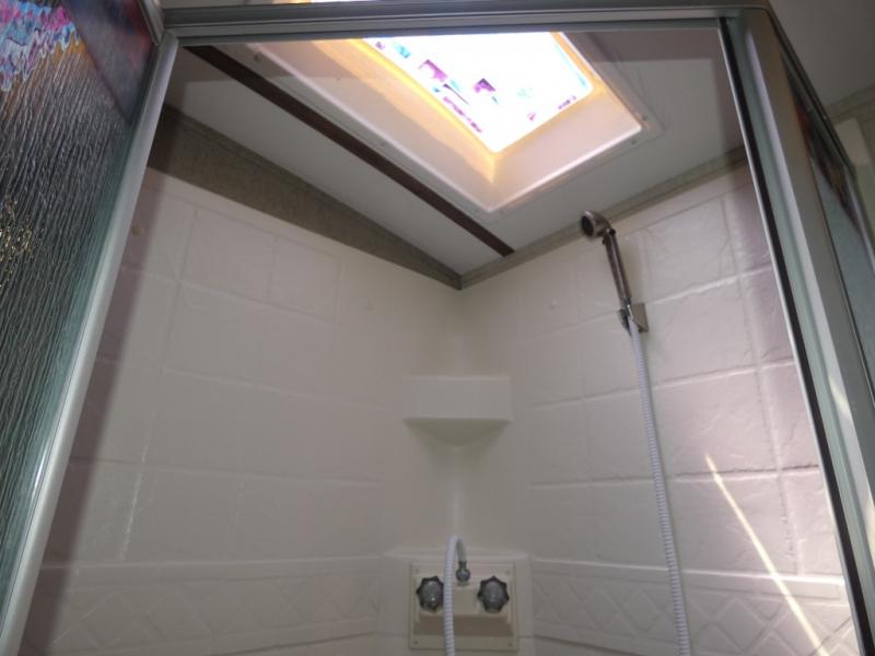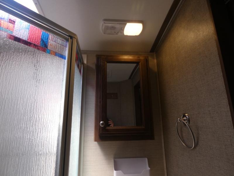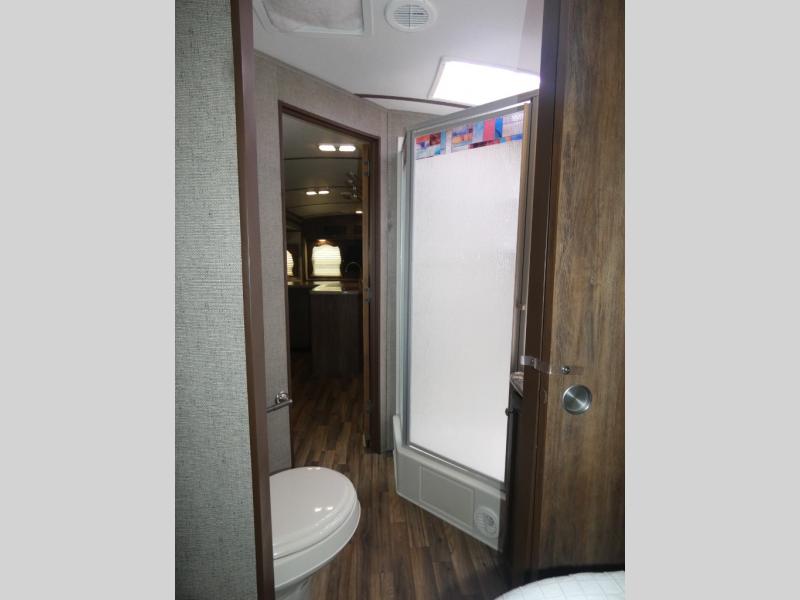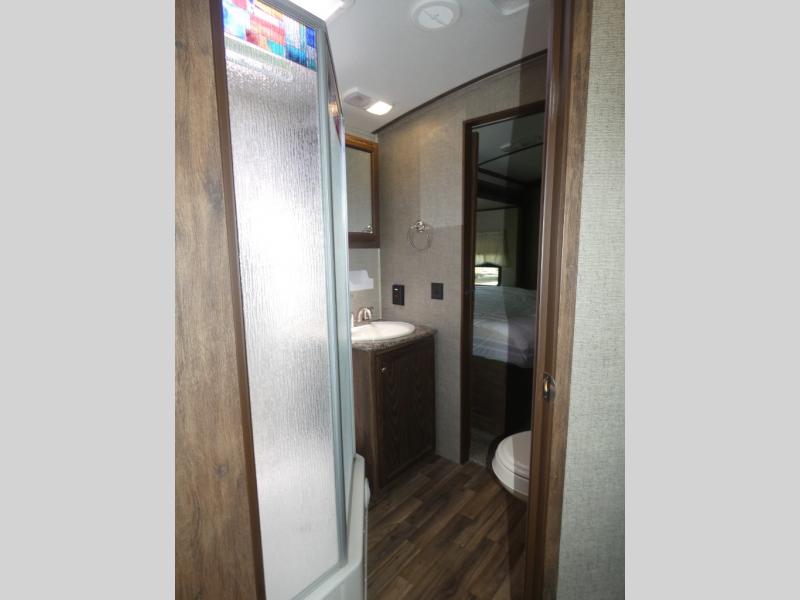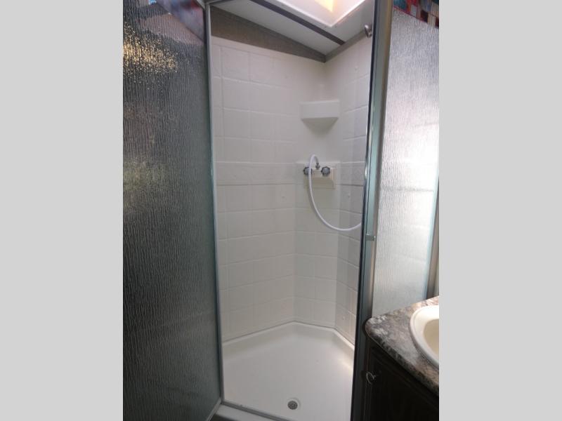 Enter and notice the convenient location of the bathroom right across from the entrance. This bath has dual entry doors to make it accessible from the front master bedroom as well as the living area. Inside you will find a neo-angled shower, a toilet, and vanity with sink, plus overhead storage.