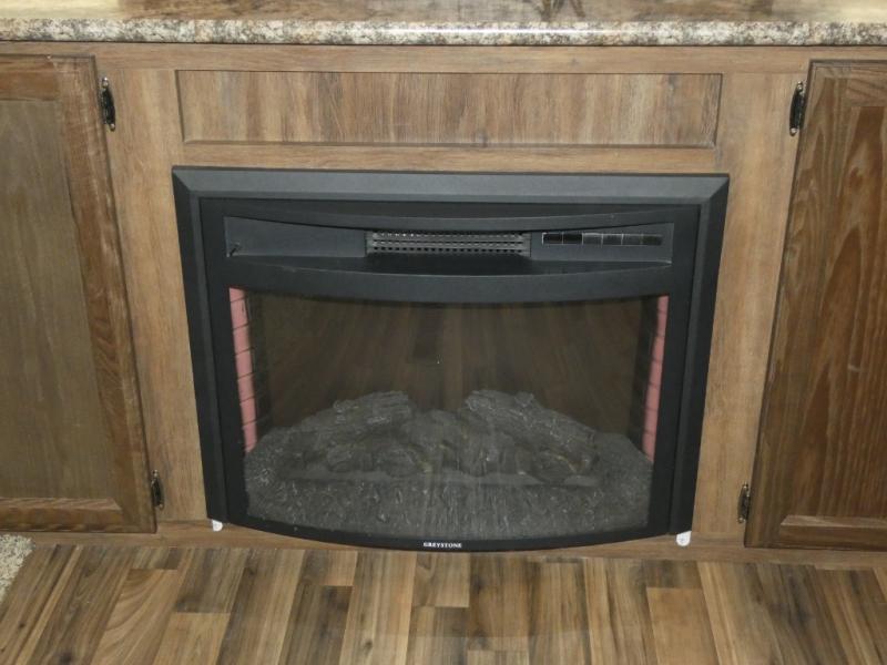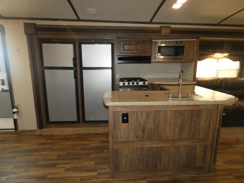 Head to your left from the entrance and notice the spacious interior with dual opposing slides. The kitchen features two side by side refrigerators, a three burner range, and a pull-out L-shaped counter. Here you will find a double sink, and plenty of storage below the counter area. A nice pantry with shelves is located along the interior wall adjacent to the slide.