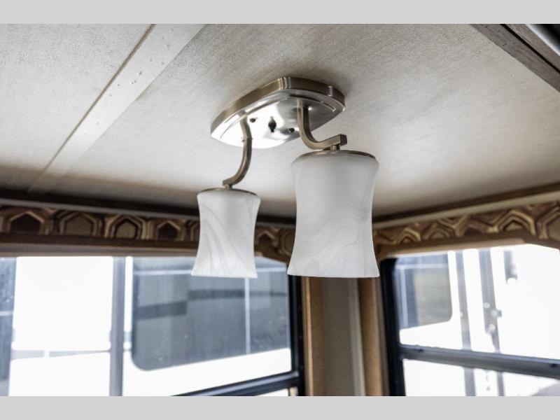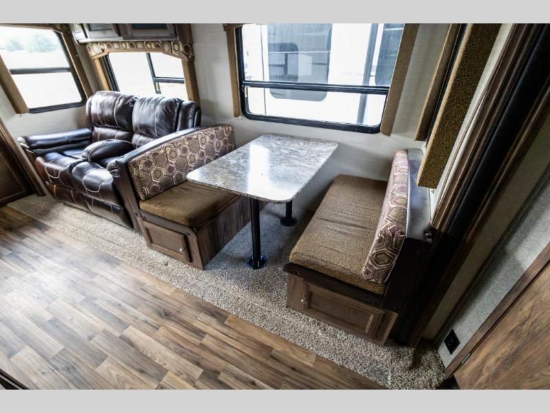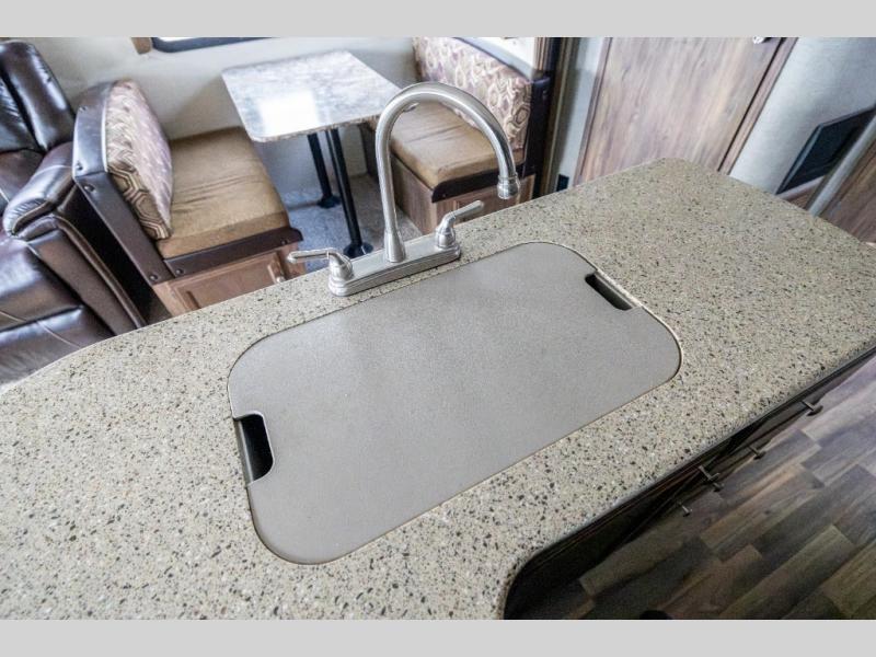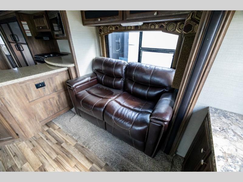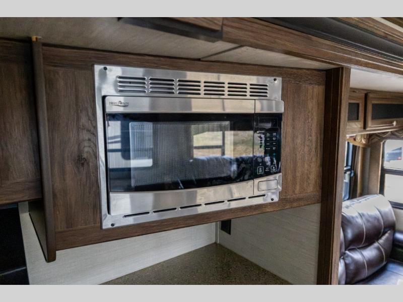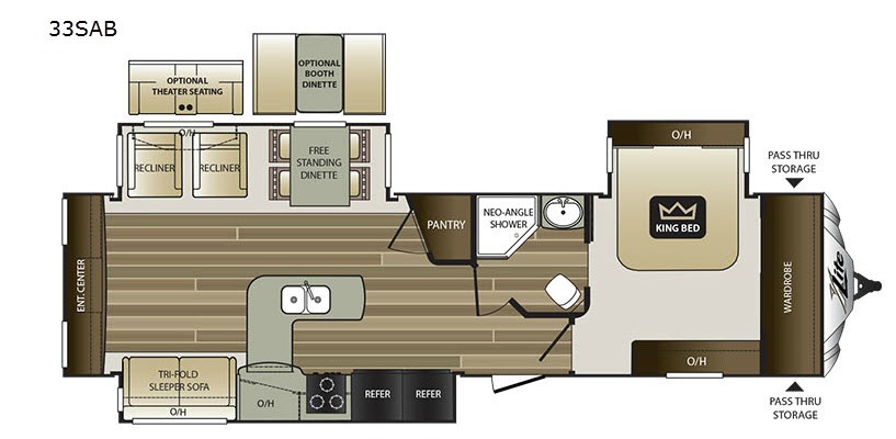 Further to the rear of this unit you will enjoy plenty of seating and relaxing space with dual opposing slide outs with the curb side slide featuring a tri-fold sleeper sofa. The road side slide features two recliners, or optional theater seating, plus a free-standing dinette or an optional booth dinette for mealtime. There are overhead cabinets above the recliners, and the tri-fold sofa can become extra sleeping space for your visiting family or friends.
