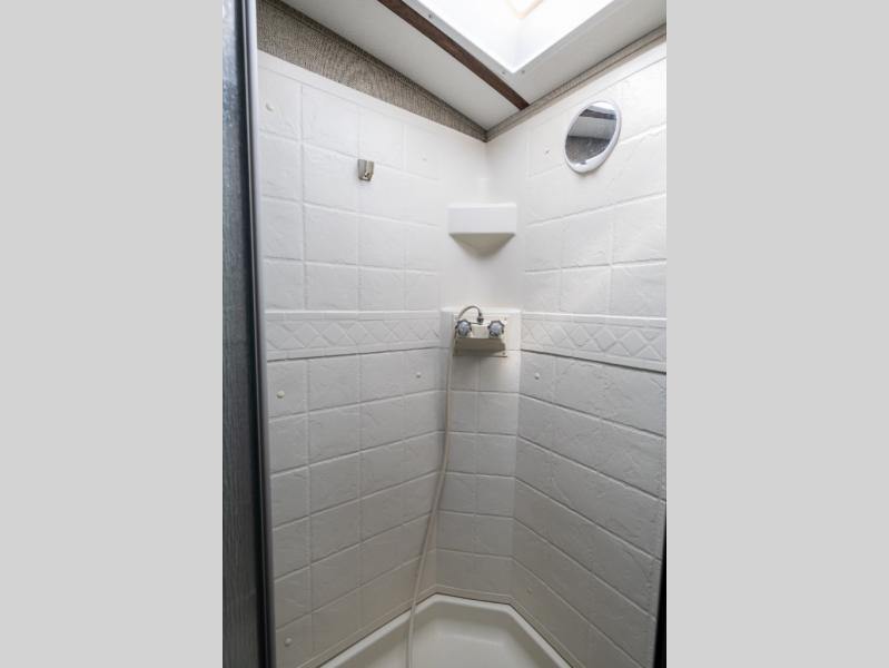 Enter and notice the convenient location of the bathroom right across from the entrance. This bath has dual entry doors to make it accessible from the front master bedroom as well as the living area. Inside you will find a neo-angled shower, a toilet, and vanity with sink, plus overhead storage.