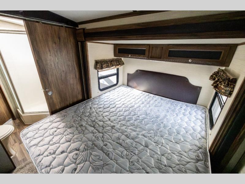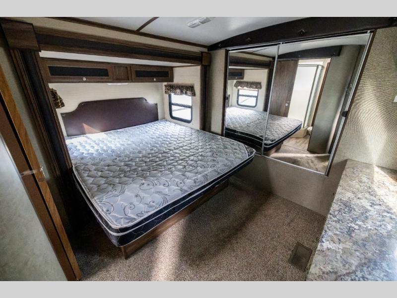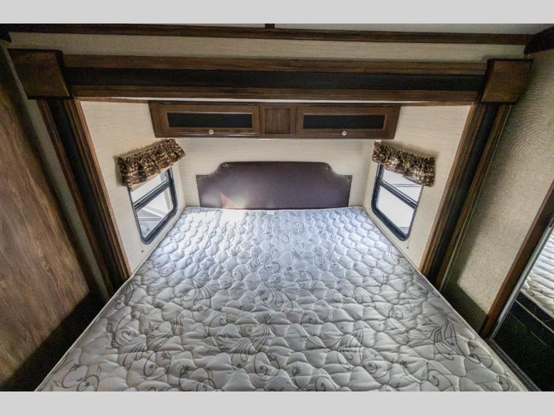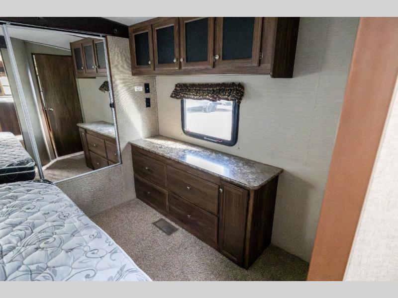 Back up front beyond the complete bath is the master bedroom where you will enjoy a relaxing night's rest. There is a slide out king size bed creating more foot traffic space to move around. You will also find plenty of storage with a full front wall wardrobe and a dresser opposite the bed with storage above, plus so much more!