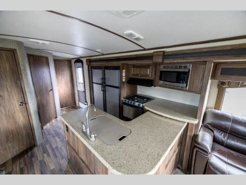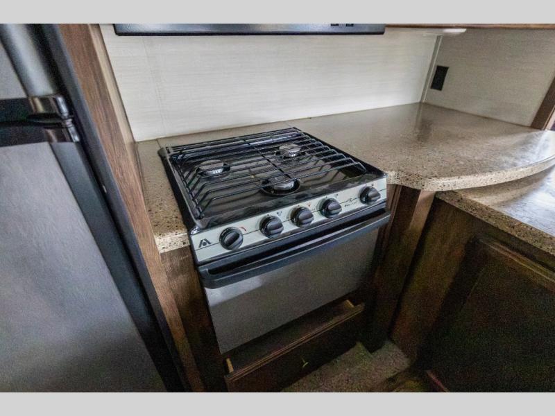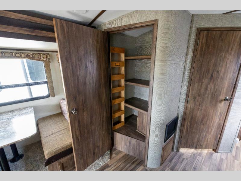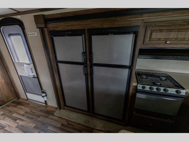 Head to your left from the entrance and notice the spacious interior with dual opposing slides. The kitchen features two side by side refrigerators, a three burner range, and a pull-out L-shaped counter. Here you will find a double sink, and plenty of storage below the counter area. A nice pantry with shelves is located along the interior wall adjacent to the slide.