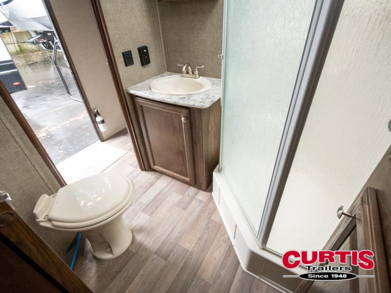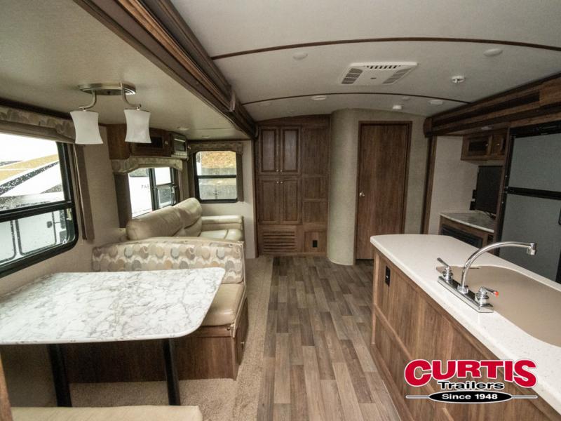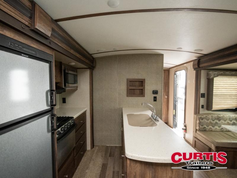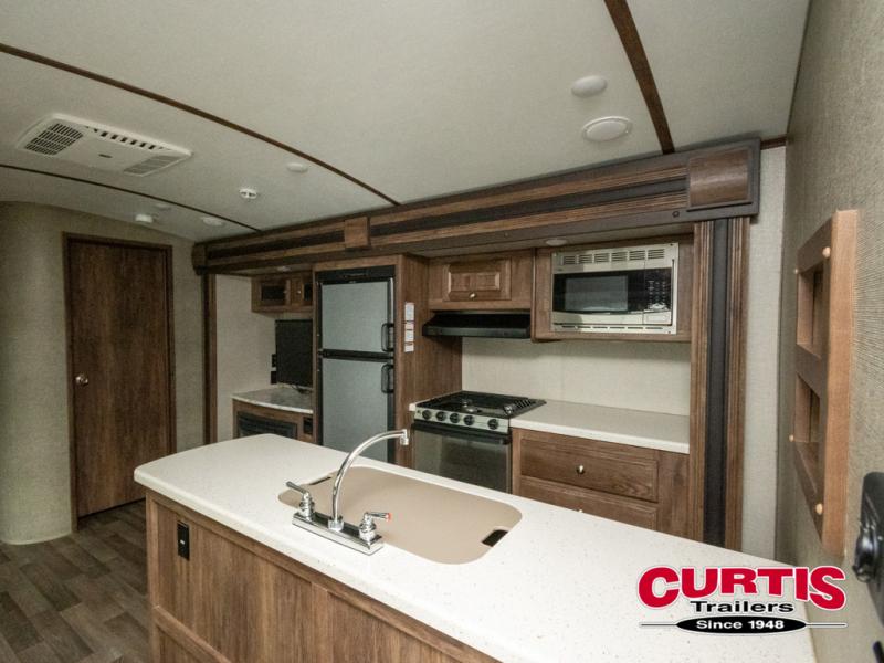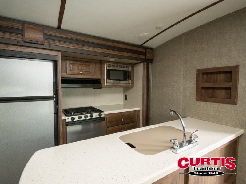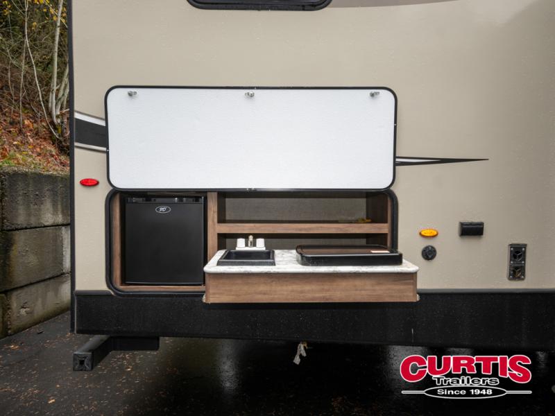 The outside kitchen includes a refrigerator, plus a pull-out camp kitchen including a single sink and two burner cooktop. You will also enjoy the front pass-through storage for all of your outdoor camping gear, and so much more!