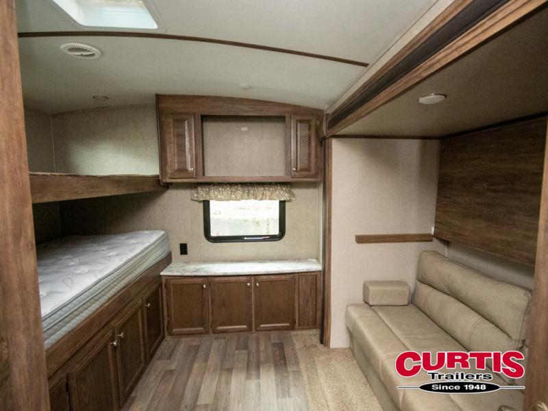 In the rear of the trailer is a private bunkhouse including a jack knife sofa below a flip up bunk slide out along the road side. On the opposite side there is a set of bunks with storage underneath. These bunks have different measurements. An entertainment center is between the set of bunks allowing everyone viewing space while they hang out in this room.