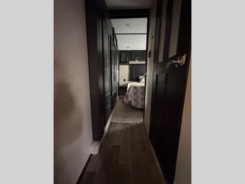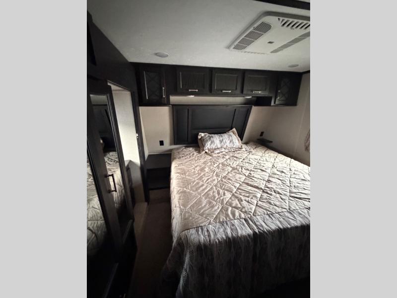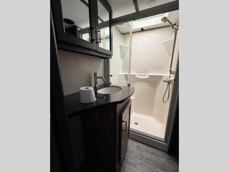 Head up the steps beyond the kitchen area and road side slide to a front master bedroom and complete bath. The bathroom is on your immediate right at the top of the steps up and features a residential shower, toilet, linen cabinet, and vanity with sink. Just out in the hall from the bathroom you have access to the linen portion of the wardrobe storage slide out located in the front bedroom even when the sliding hallway door is closed.
