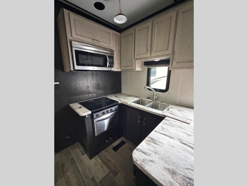 You are going to love all of the residential luxuries in this Keystone Fuzion toy box on wheels! This fifth wheel toy hauler features an 11' garage area complete with overhead loft, a spacious living area inside including a residential queen or Fuzion king bed, and an 18 cu. ft. gas/electric RV refrigerator, plus so much more!