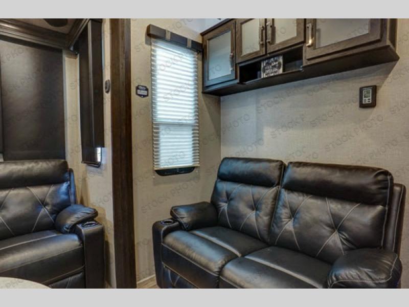 The opposite side of the main living space features a slide out sofa, and there is also a smaller sofa along the interior wall with storage overhead.