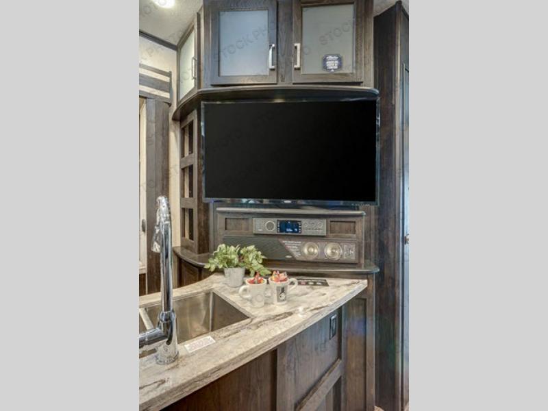 Enter the living space through the interior garage door, or through the centrally located side entry closest to the front. Here you will find a wide open space that contains the kitchen and living room. There is a slide out 18 cu. ft. gas/electric RV refrigerator or choose an optional residential refrigerator and three burner range, plus a counter peninsula off the outer angled 1/2 bath wall that also features an LED TV. You will also find a pantry for your non-perishables, and overhead cabinets for ample storage for your dishes and things.