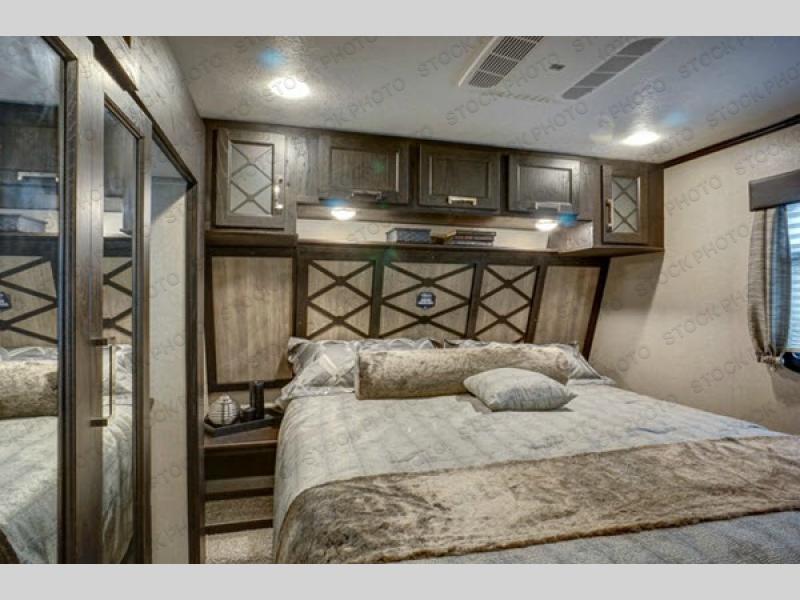 The master bedroom is spacious thanks to the large slide out wardrobe and drawers. You will easily be able to get a great night's rest on the residential queen bed or choose a Fuzion king size bed option. There is also storage overhead, and beside the bed, plus so much more!
