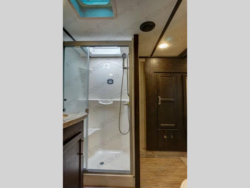 Head up the steps in front to the right of the main door to a front master bedroom and bath. The bath is first on your left at the top of the steps and features a residential shower, toilet, and vanity with sink. There is a door in the hall, plus a second door that slides and leads you into the front master bedroom where you have immediate access to the wardrobe slide from inside the bath.