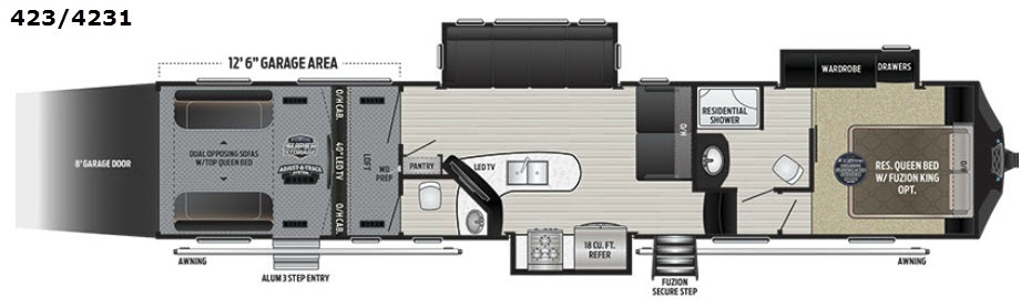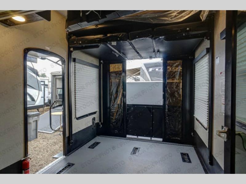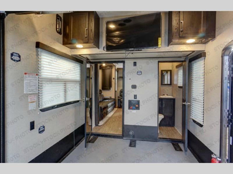 SPEAK TO A SALES PRO IN OCALA FL. 352-622-2886You will love the 8' rear ramp garage door for ease of loading your off-road toys. You will find in this garage area plenty of overhead cabinets for your gear, and a drop down top queen bed with dual opposing sofas in the rear cargo space for added sleeping and seating once things are unloaded at camp. There is also a loft in front, a space prepped for a washer and dryer if you choose to add, and a 40" LED TV. A convenient half bath is an added bonus so you can keep all the dirt and grime out of the main living quarters.
