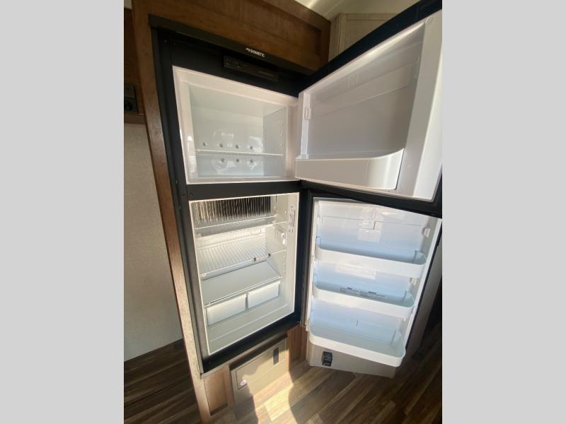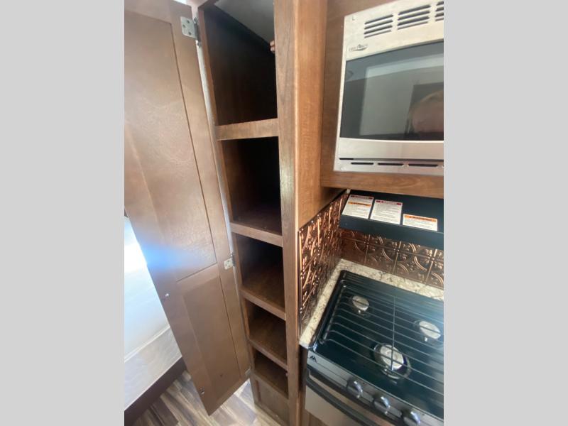 To the right of the entry door you will find a double kitchen sink, three burner range, overhead cabinet, and a pantry. On the opposite side of the trailer there is a refrigerator and full bath.