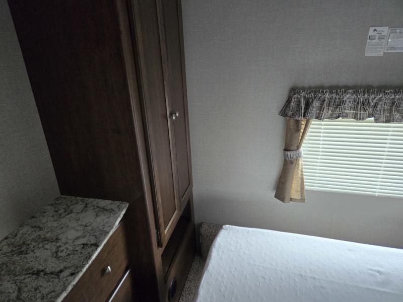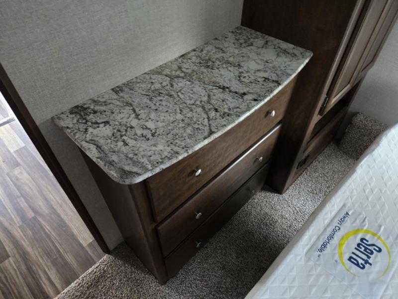 The front private bedroom provides a comfy queen bed with two closets for clothing storage, a vanity, nightstand, and overhead cabinets above the bed, plus so much more!