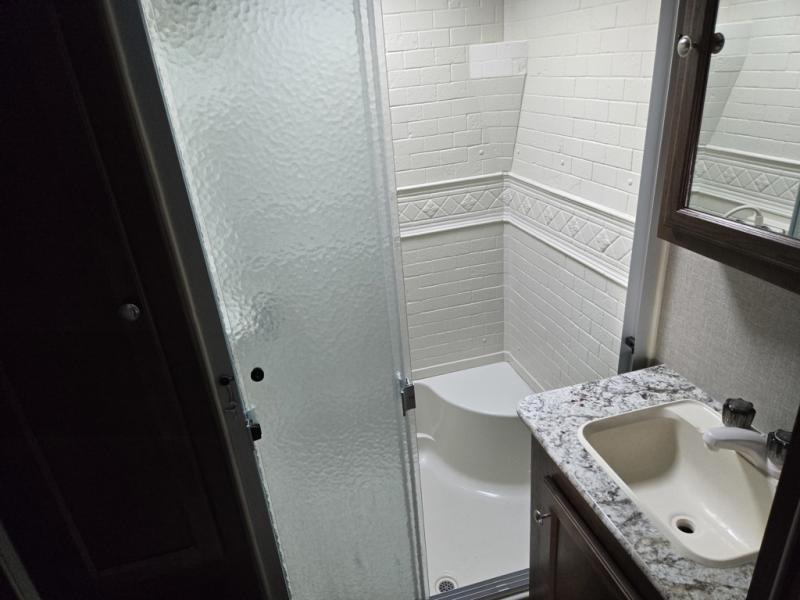 Head toward the front to find a side aisle bath on your left side after stepping up to the hallway. The bath includes a shower, sink, toilet, and linen storage.