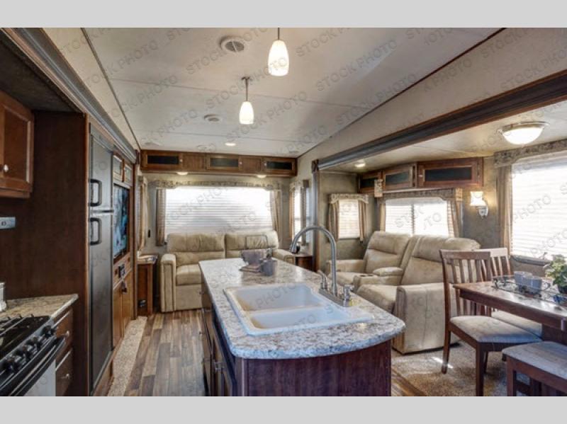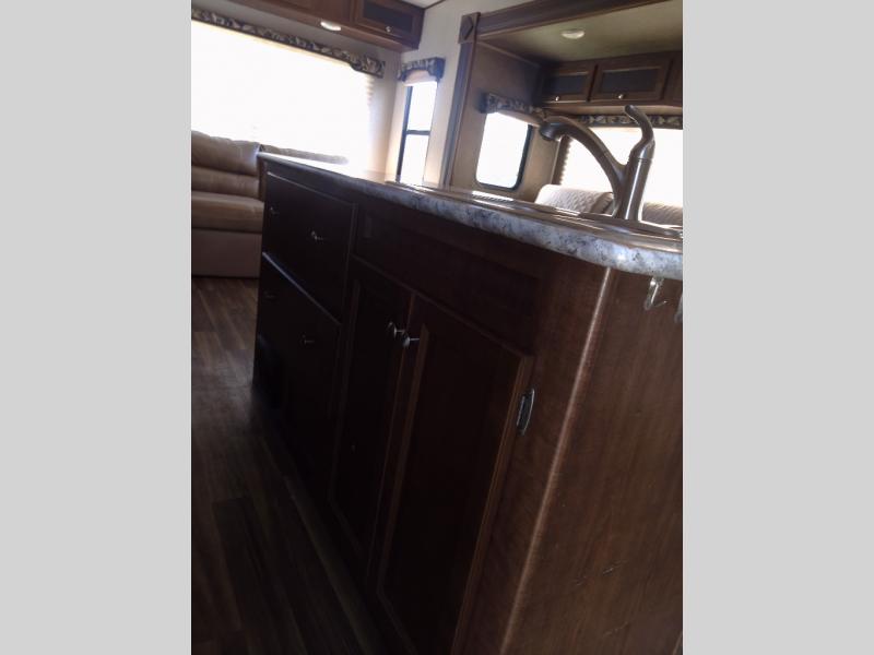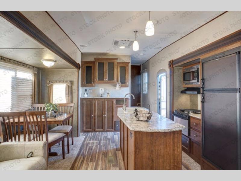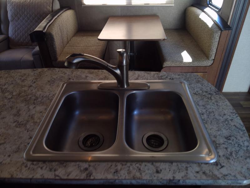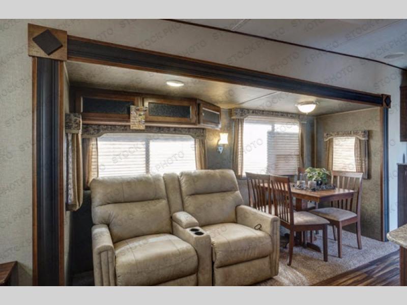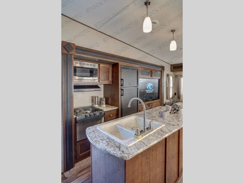 As you enter you will find a slide out entertainment center along with a refrigerator and three burner range to your immediate left. There is a kitchen island with a double sink for extra prep space, plus an additional countertop and overhead storage is along the interior wall. The opposing second slide in this area features theatre seating for two and a u-shaped dinette for meals or even extra sleeping space. Along the rear wall you will find a sofa with end tables and overhead storage. This area makes a great entertainment space.
