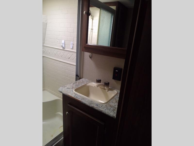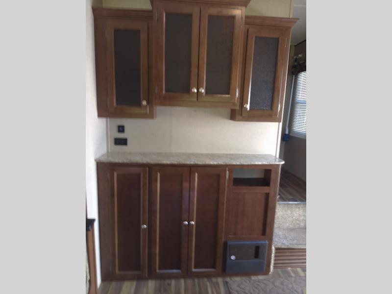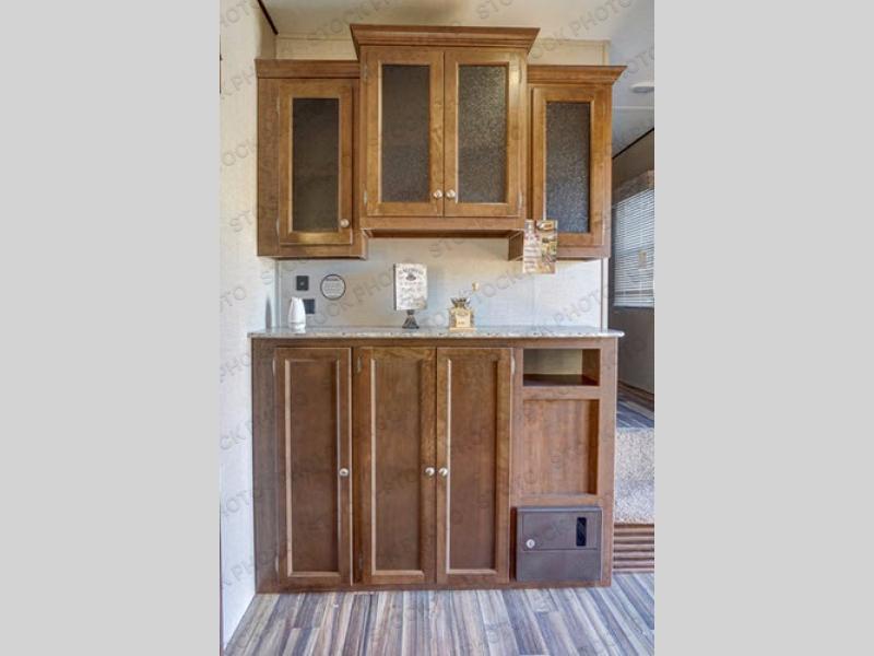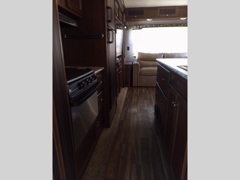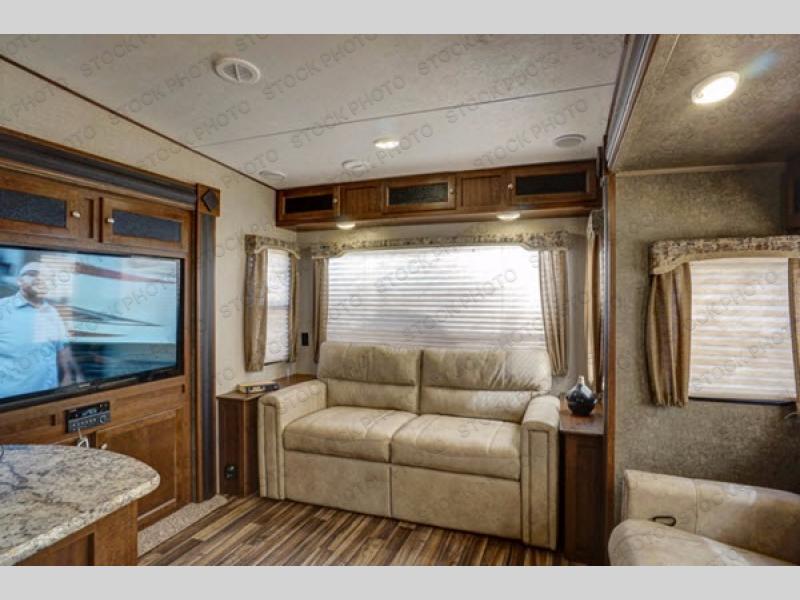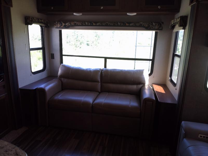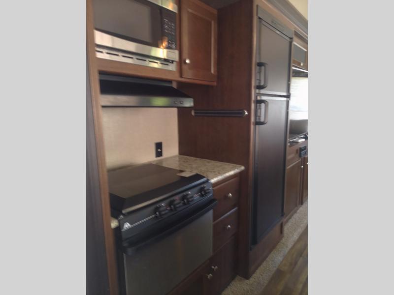 As you enter you will find a slide out entertainment center along with a refrigerator and three burner range to your immediate left. There is a kitchen island with a double sink for extra prep space, plus an additional countertop and overhead storage is along the interior wall. The opposing second slide in this area features theatre seating for two and a u-shaped dinette for meals or even extra sleeping space. Along the rear wall you will find a sofa with end tables and overhead storage. This area makes a great entertainment space.