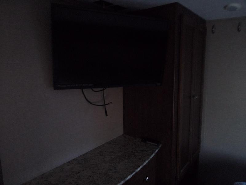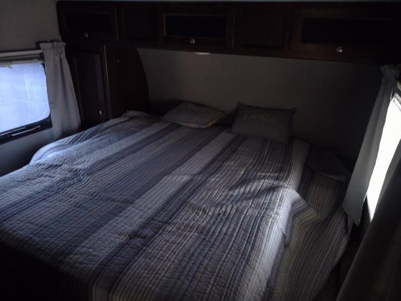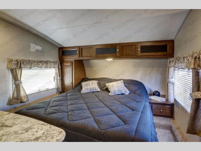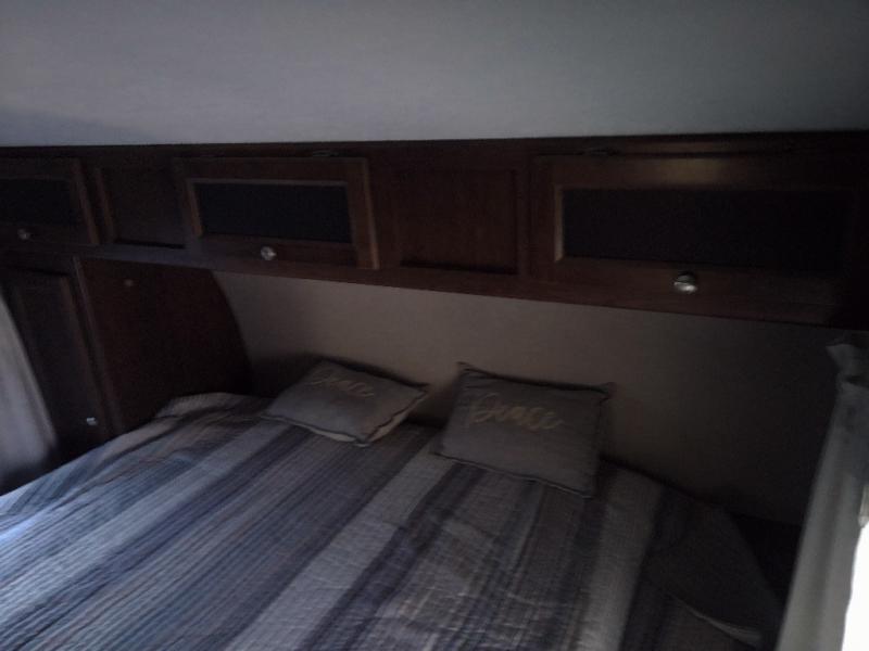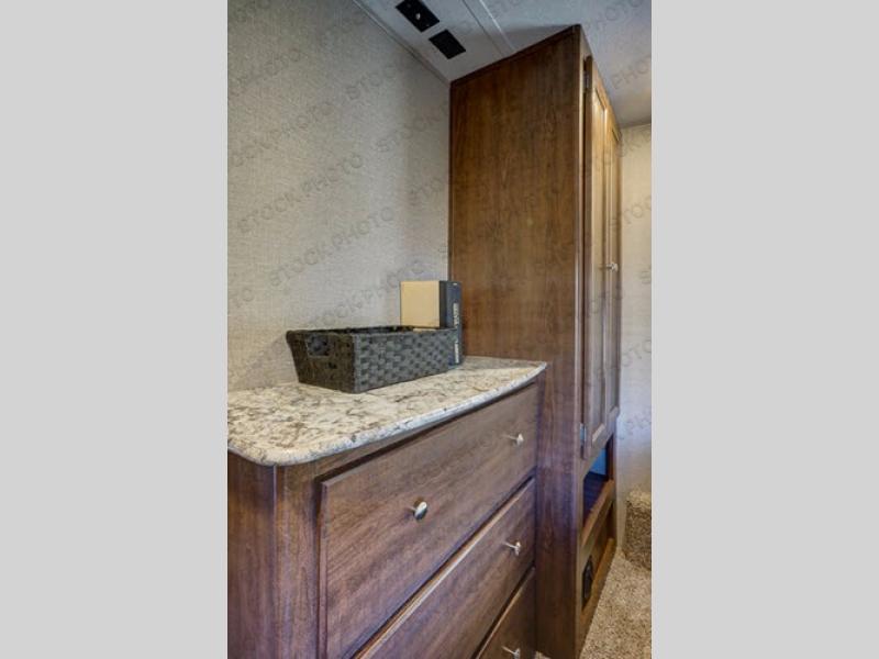 The front private bedroom provides a comfy queen bed with two closets for clothing storage, a vanity, nightstand, and overhead cabinets above the bed, plus so much more!