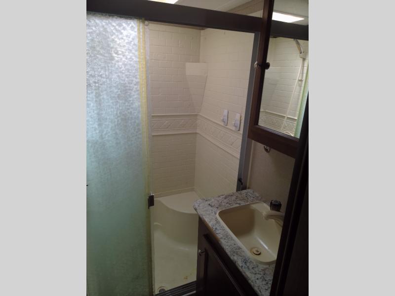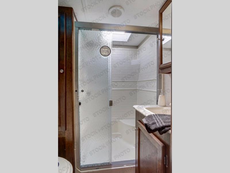 Head toward the front to find a side aisle bath on your left side after stepping up to the hallway. The bath includes a shower, sink, toilet, and linen storage.