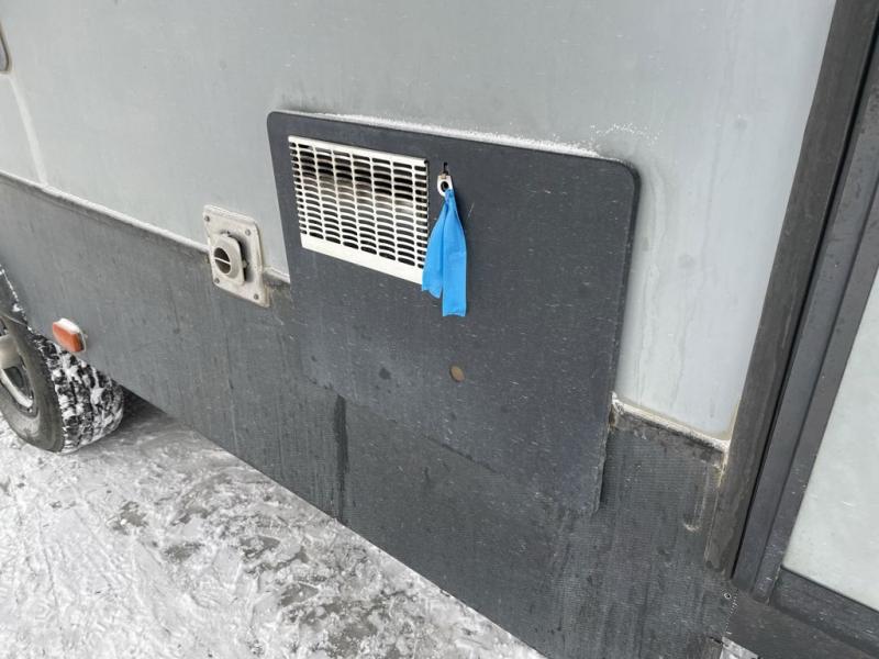Move into the main living area through the interior man door, and find that the bathroom is a walk-thru with a sink, medicine cabinet, and linen storage on one side of the trailer. On the opposite side find a toilet and tub.