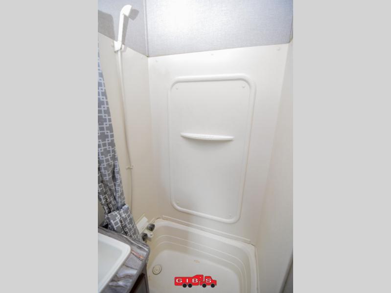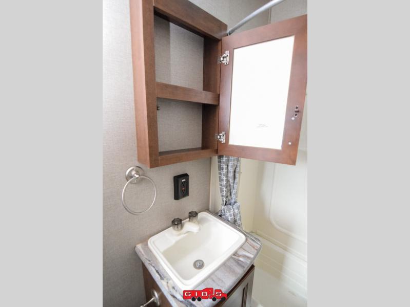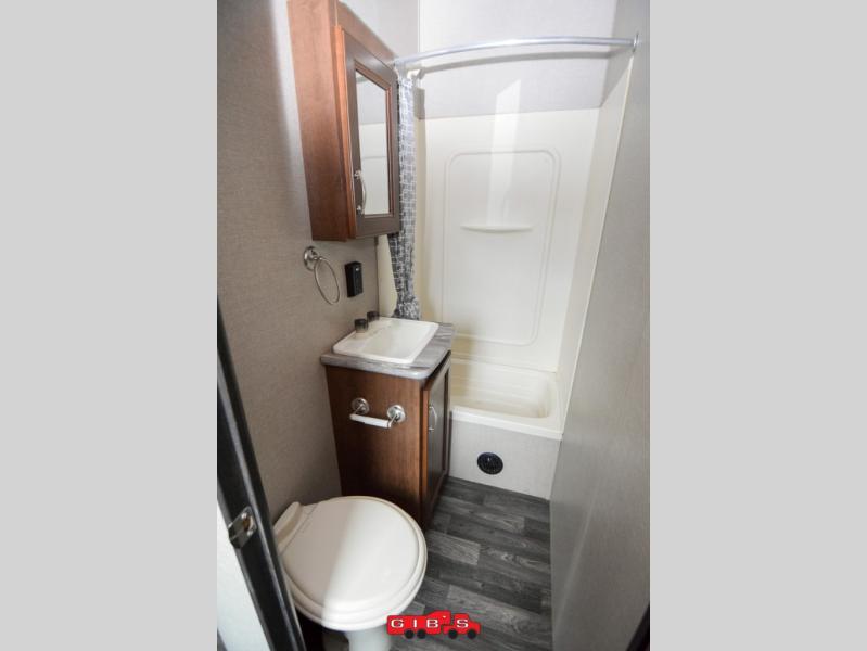 Heading into the main living space through a door in the cargo area find a nice full bath on your left just inside. There is a toilet, sink and tub. The placement is perfect so you don't have to have anyone running all through the unit from the cargo area when dirty to get to the bathroom.