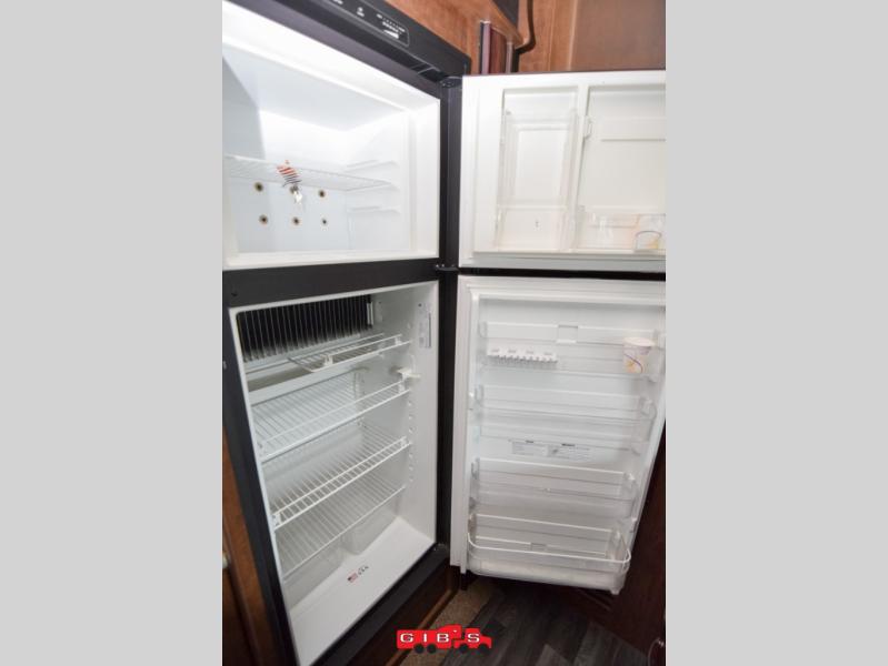 In the kitchen area there is a counter peninsula with double sink, overhead cabinets for storage, a pantry for dry goods, and a slide out 8 cu. ft. refrigerator and three burner range just inside the main entry door.