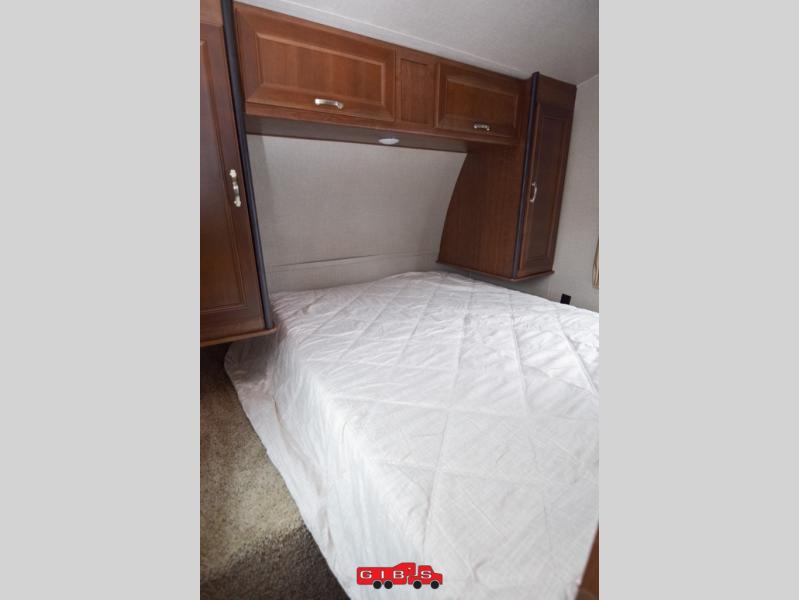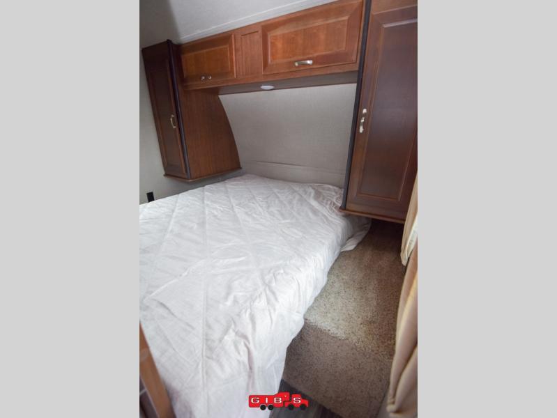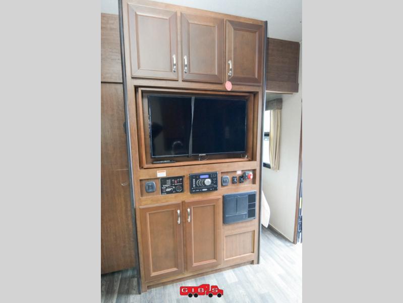 The very front of this unit offers a bedroom with dual entry doors. One door on either side of the entertainment center. Inside the room find a queen bed, plus two bedside wardrobes, overhead cabinet, and so much more!