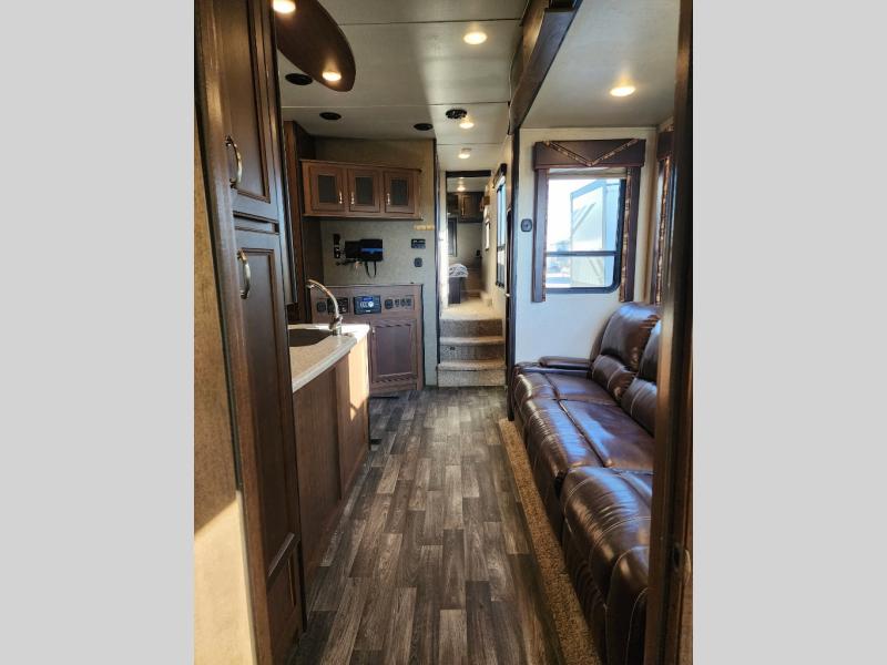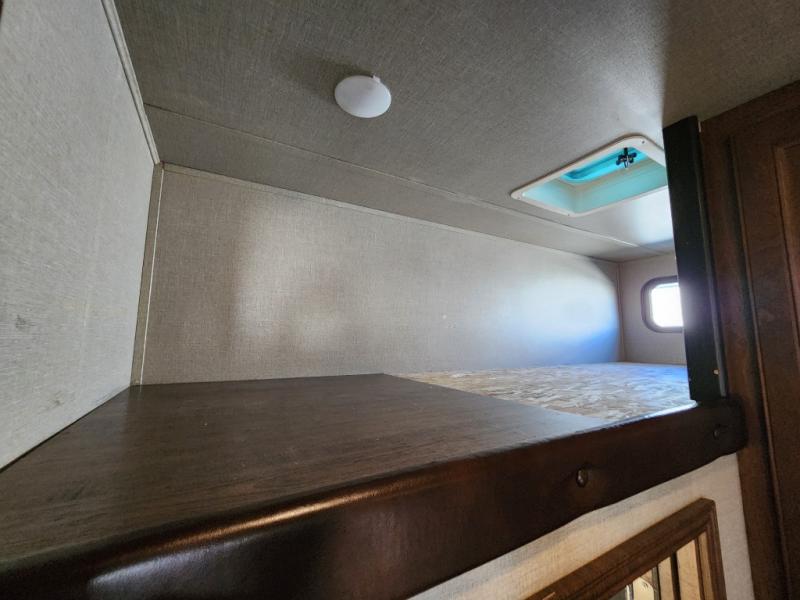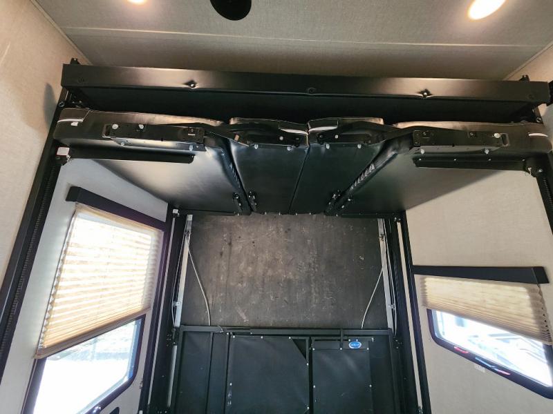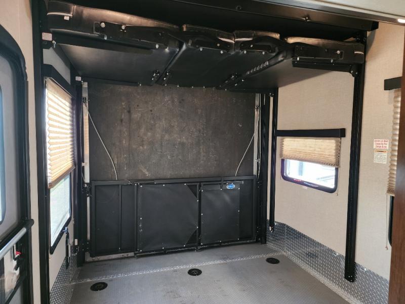Step inside the cargo area of model 361 either using the rear ramp door, or side man door. Once inside you will see just how easy it will be to secure your load. The 5K inter-lock system is sure to impress, keeping your toys completely secure as you travel. You will also notice the convenient half bath, and dual opposing sofas with top queen bed for ample seating and sleeping space when you bring along extra guests. There is also a twin loft area at the front of the cargo space that overlooks the main living area inside that your younger campers will surely love.