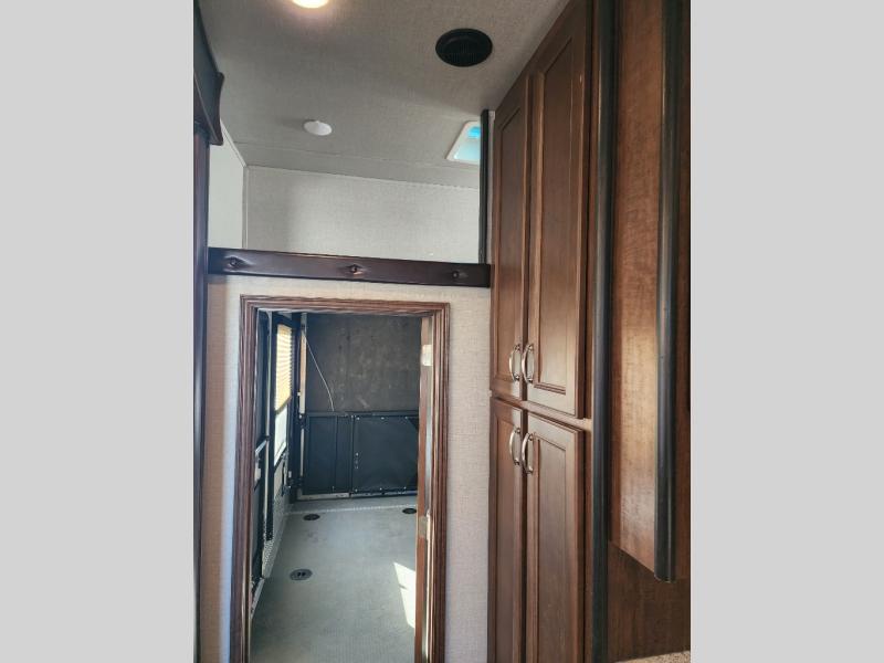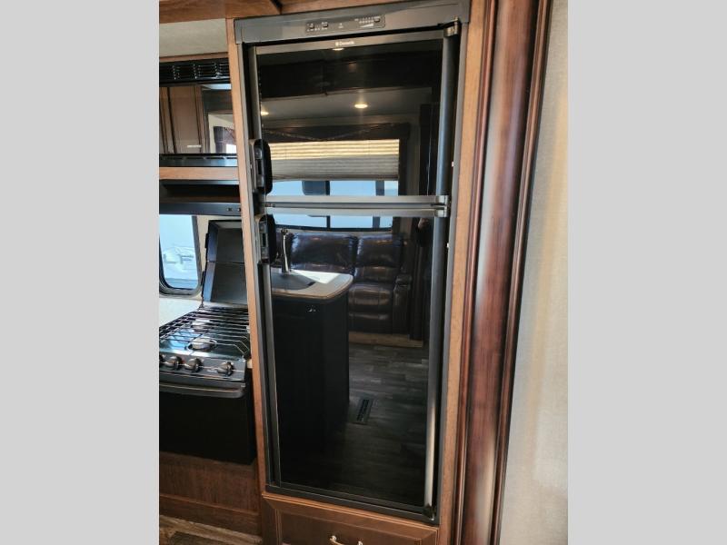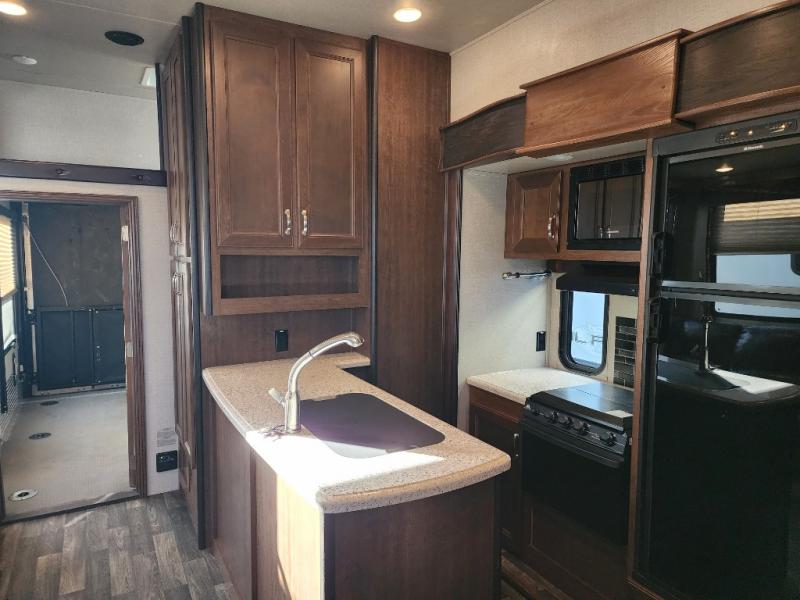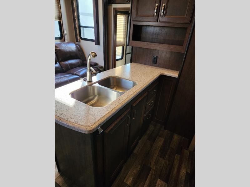 Enter the main combined kitchen and living room via the garage area, or from the second side entry door. Here you will see a wide open combined space thanks to dual opposing slides. There is a slide out three burner range and 8 cu. ft. refrigerator opposite the door side, along with a food pantry in the corner along the interior living room wall. There is also a counter peninsula where you will find the double sink and more storage.