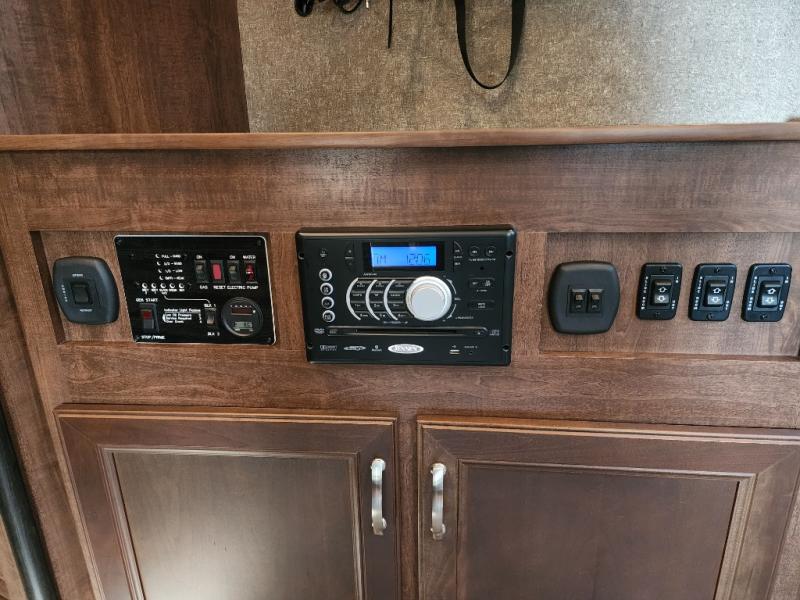 The front master bedroom offers a relaxing space away from the hustle and bustle of the main living area and includes a residential queen or king size bed with overhead storage, nightstands, as well as a slide out wardrobe. There is also a TV along the interior bedroom wall for perfect viewing from bed, plus so much more!