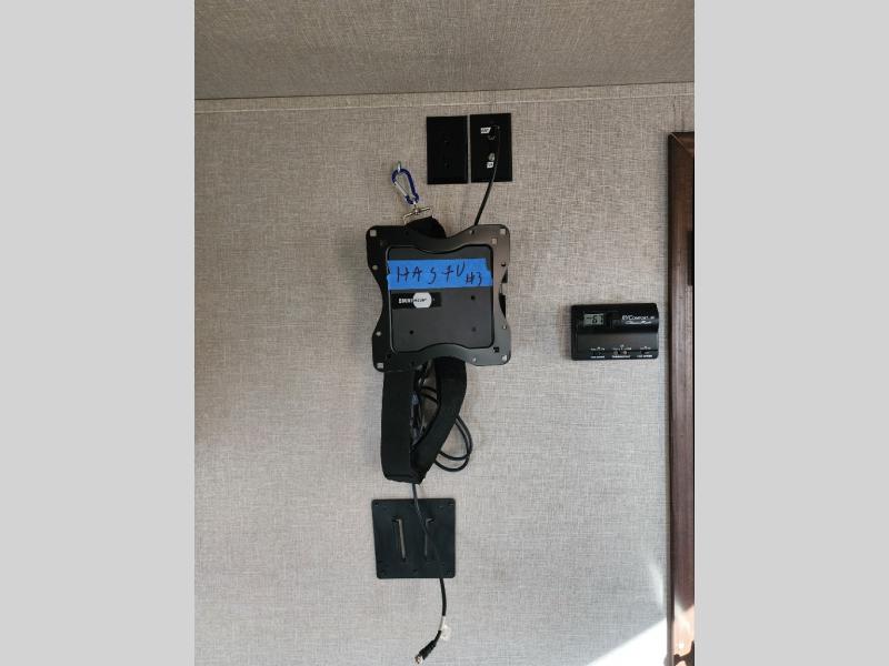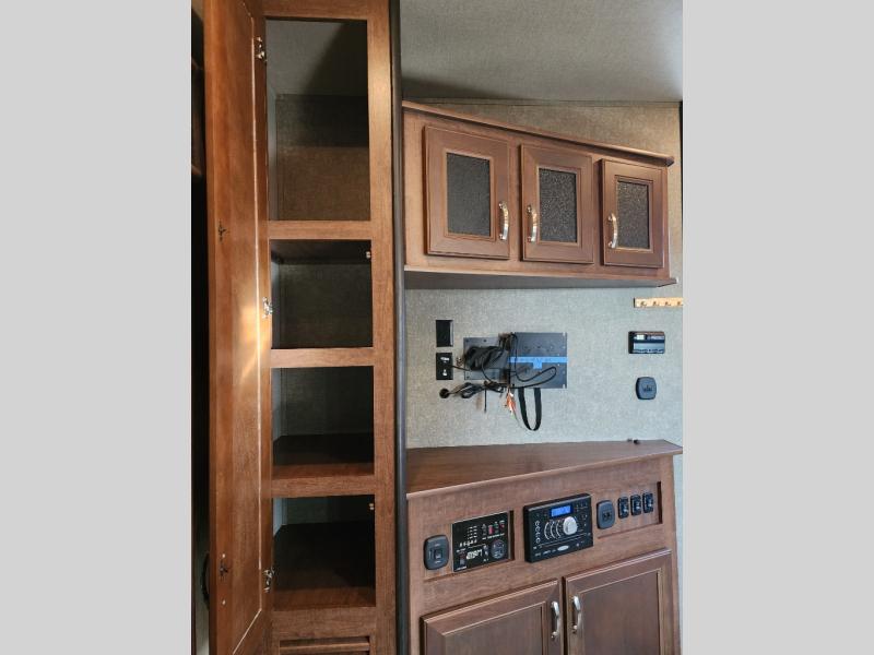 To the left of the main entry door find a large slide out featuring a reclining sofa. There is also a 40" LED TV adjacent next to the food pantry cupboard for easy viewing.