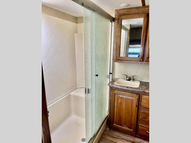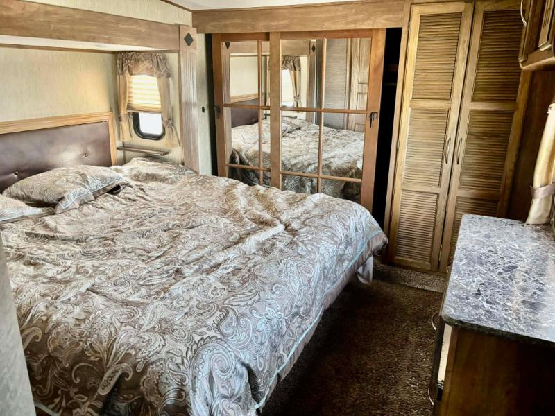 In the bedroom you will enjoy a great night's rest on the king bed provided which slides out giving you plenty of space to move around. There is storage in the dresser opposite the bed, and all across the front wall giving you ample space to store all of your things.