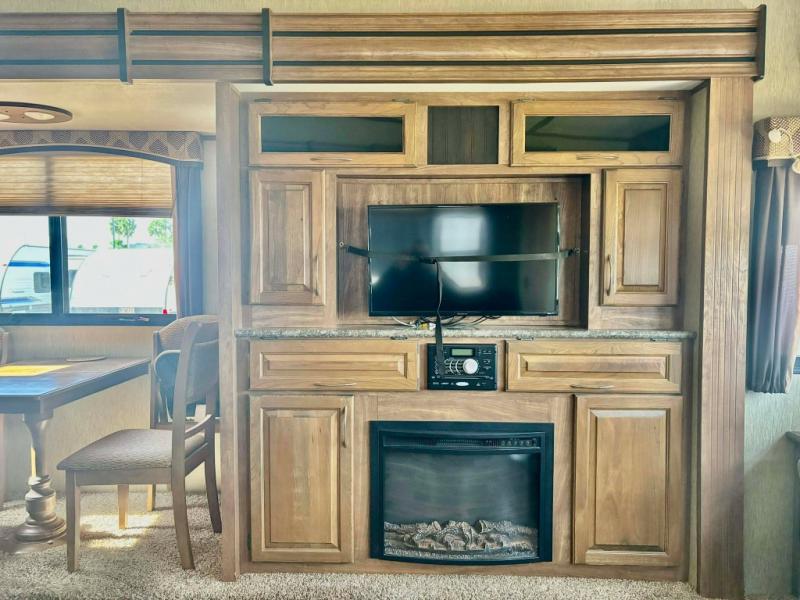 To the left of the door there is a free standing dinette and 39" TV with fireplace beneath in a slide out. Outside you can enjoy the outdoor kitchen that is found within the slide and includes a refrigerator, TV, outside stereo, and overhead cabinets. This is a feature any chef in the family would certainly enjoy!