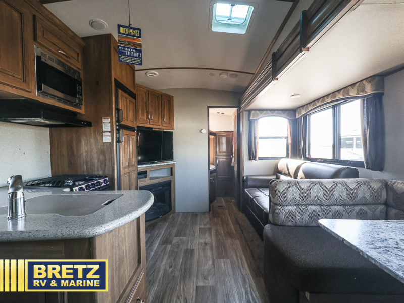 Opposite the door side find a slide out booth dinette and tri-fold sofa sleeper with storage above. A corner entertainment center is across from the sofa and can easily be viewed from any seating in the room.