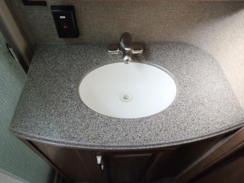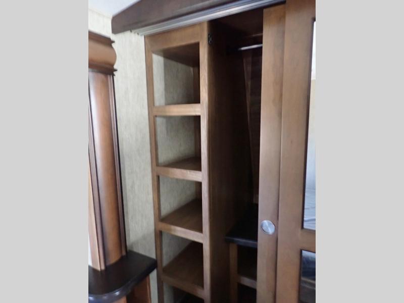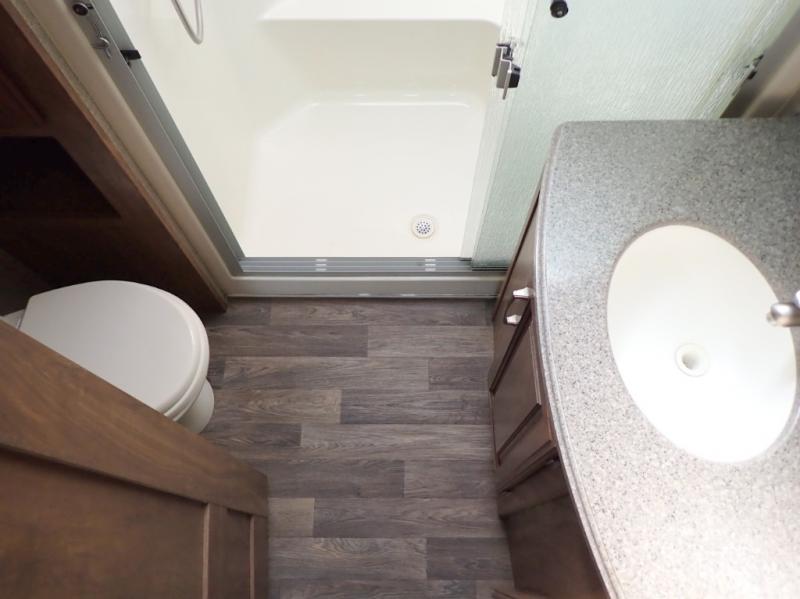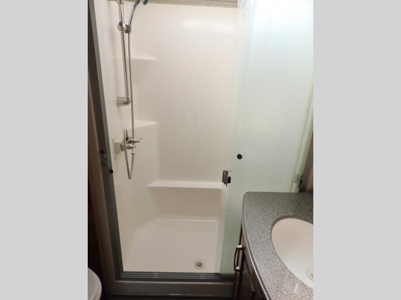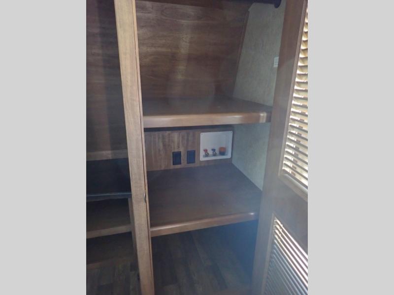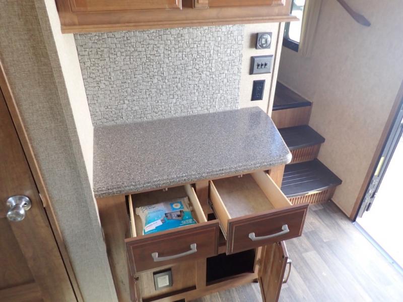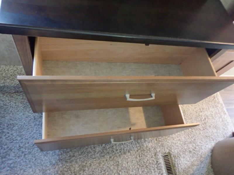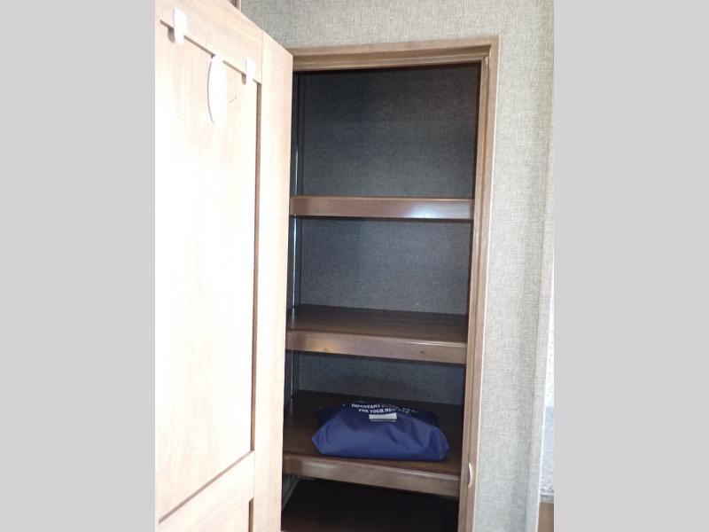 The front master bedroom provides ample space and a comfortable queen or optional king bed slide out. You will enjoy storage beneath the bed for extra things like blankets, or larger items like suitcases and things. You will also find a dresser opposite the bed with an HDTV above, plus a seating area along side. The front wall features a closet with space in the corner that has been prepped for a washer/dryer.