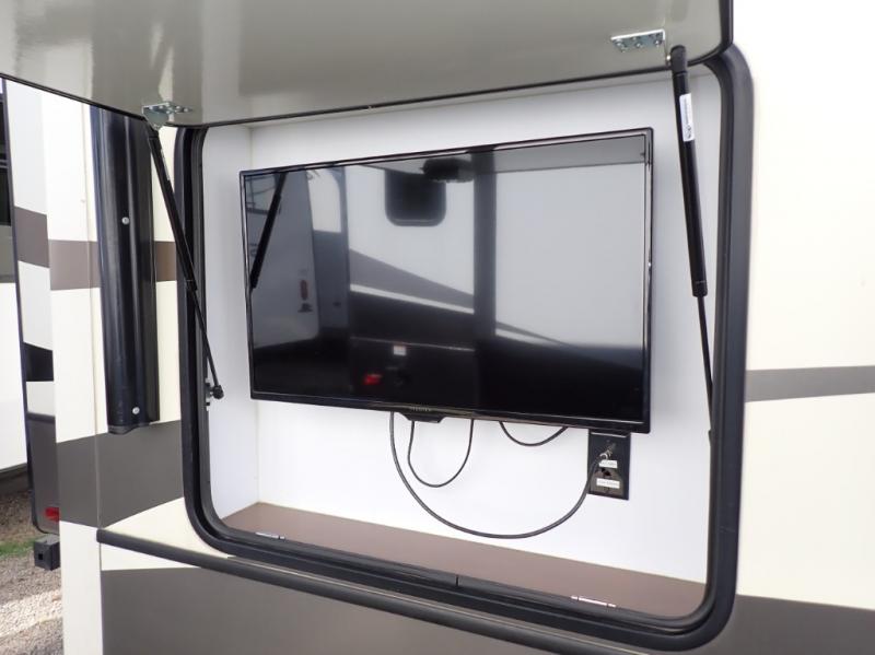 Outside you will enjoy plenty of storage, an outdoor entertainment center, and two awnings. One 18' awning covers the main entry door, and a smaller awning covers the door side slide giving you a large outdoor protected space from the elements to enjoy, plus so much more!