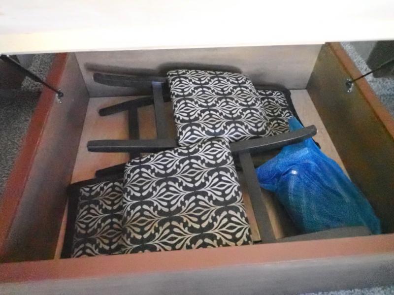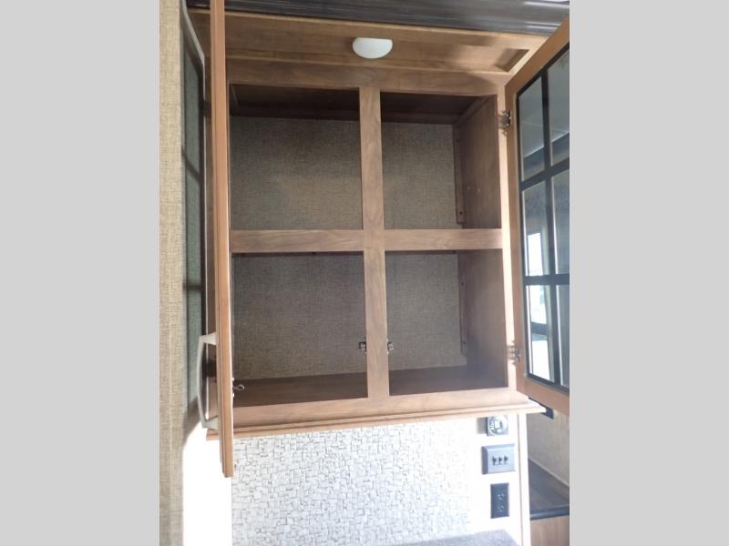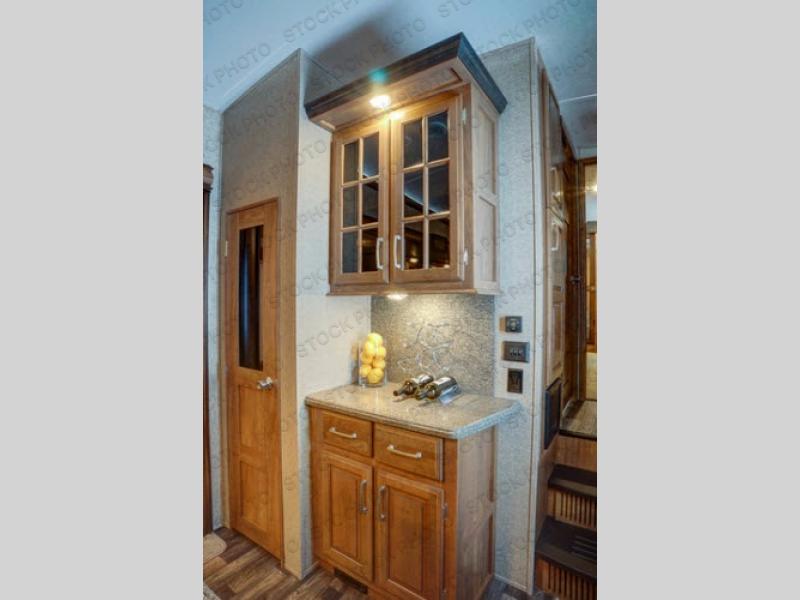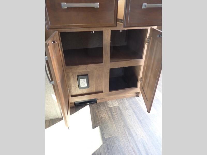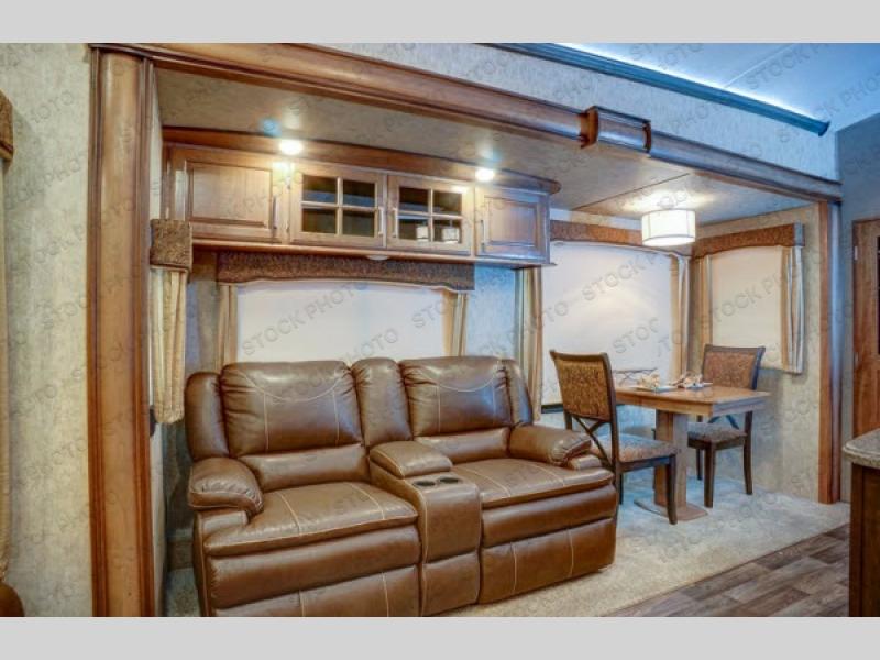 The slide opposite the door features a dinette with four chairs, and optional theater seating for two with cup holders and overhead cabinets the entire width of the slide.