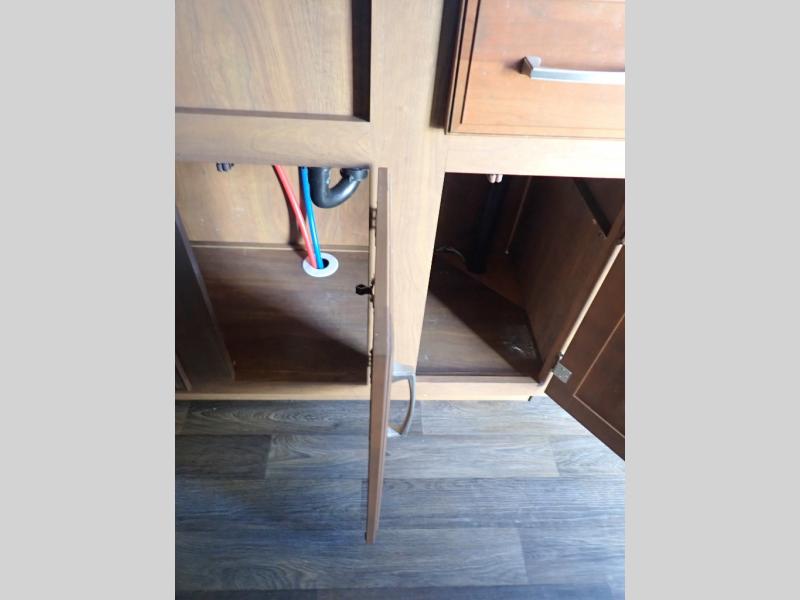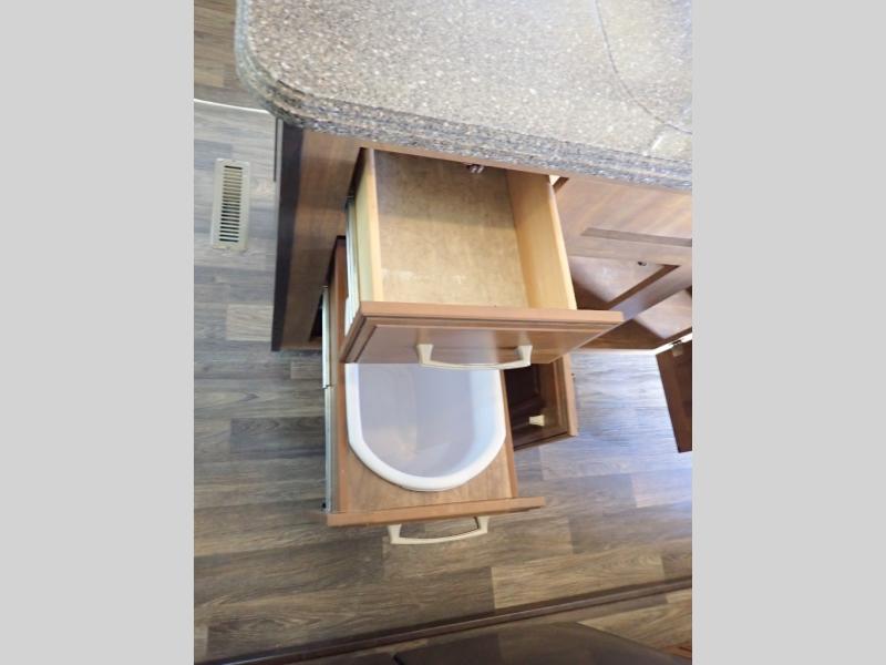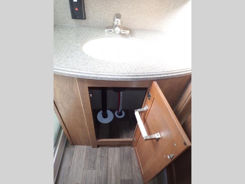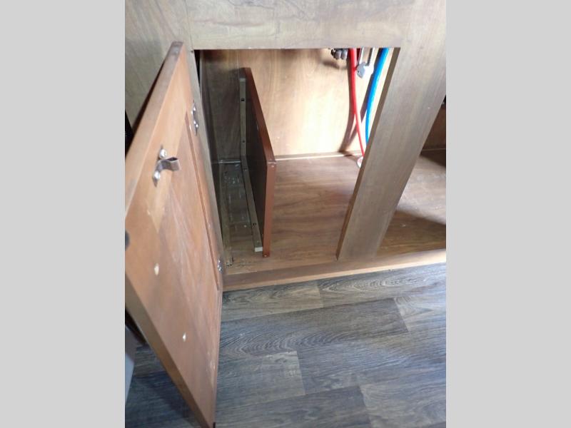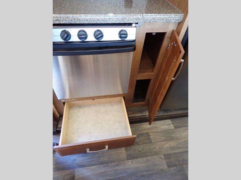 Straight in from the door along the interior living area wall there is more storage with a counter including overhead cabinets, and a pantry for dry and canned goods.