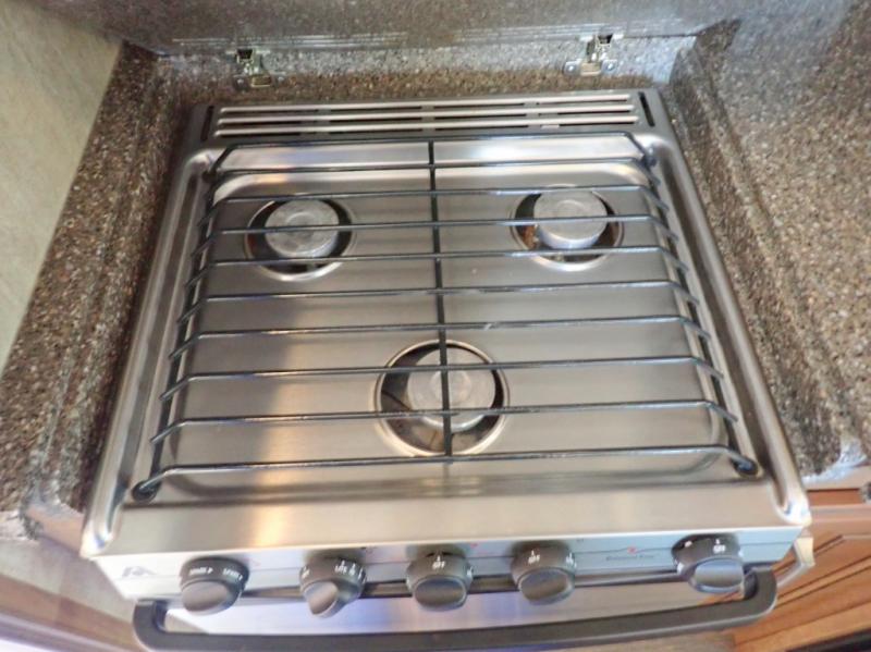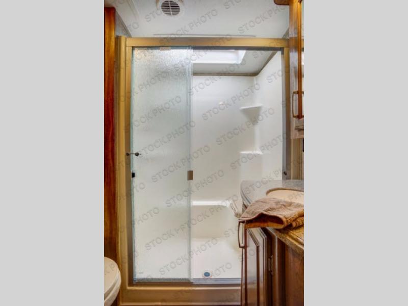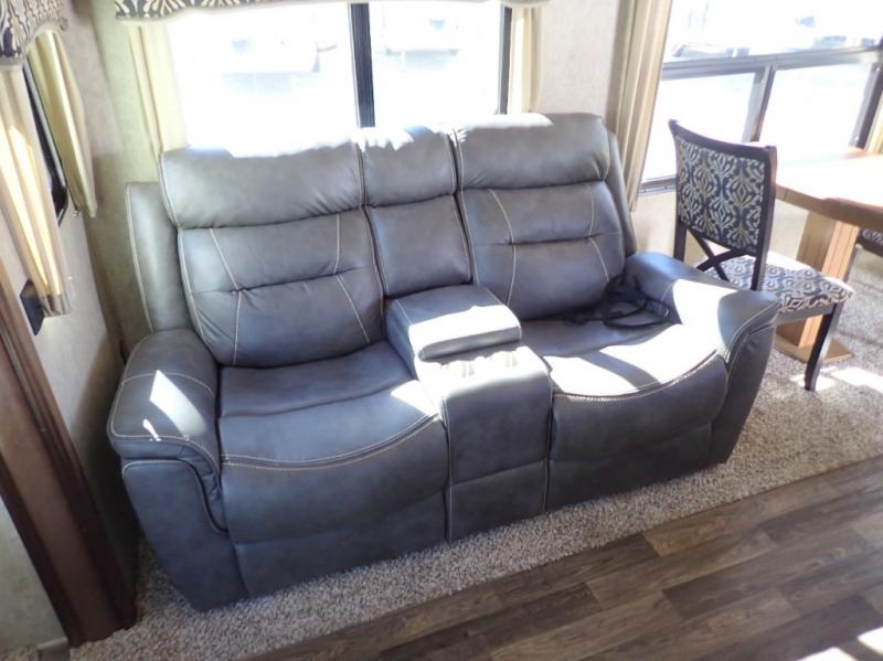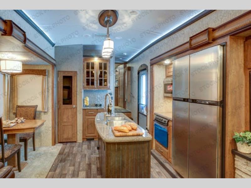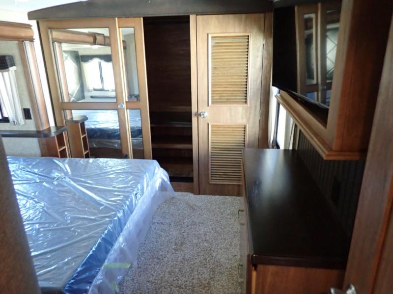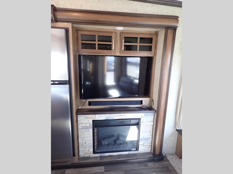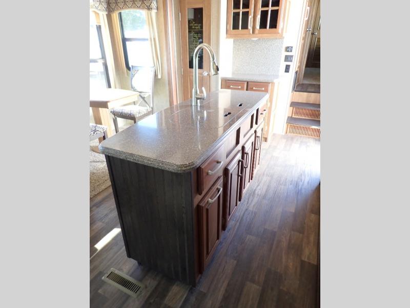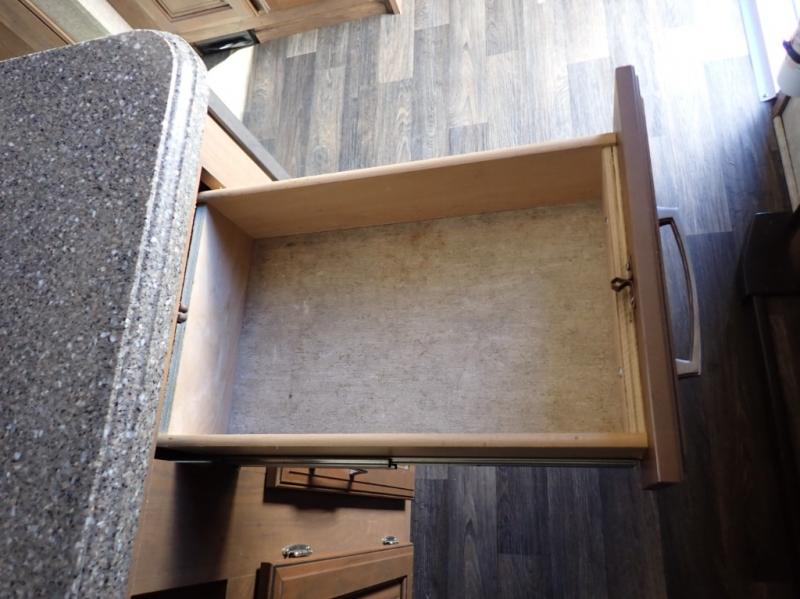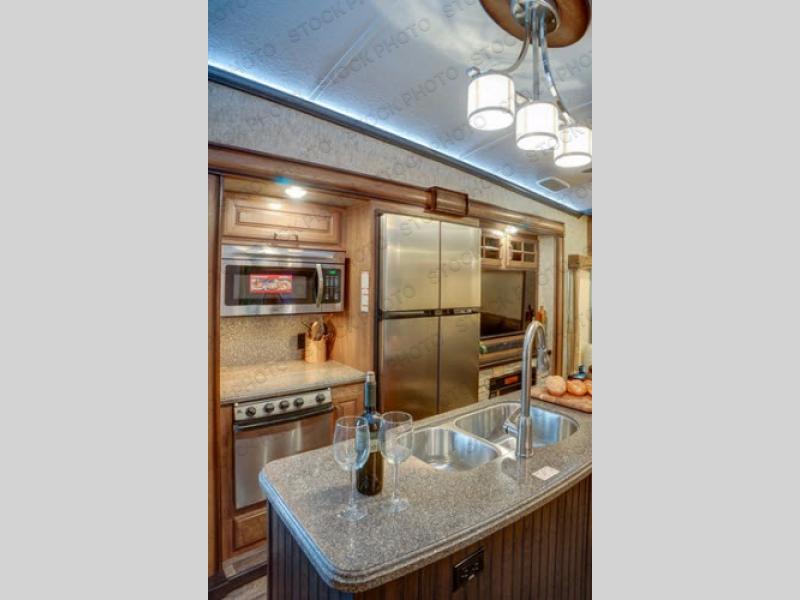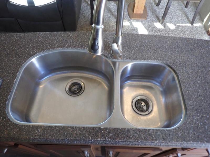 Step inside and see a spacious gathering place to the left of the door. There are dual slides that offer increased floor space giving you an at-home feel. There is a three burner range with convection microwave oven, a double door refrigerator, and an entertainment center with HDTV and fireplace in the slide out to the left of the entry door. You will also find a convenient kitchen island that offers counter food prep space and double sinks for cleaning up. The overhead cabinets, and lower cupboards and drawers will make storing your dishes easy too.