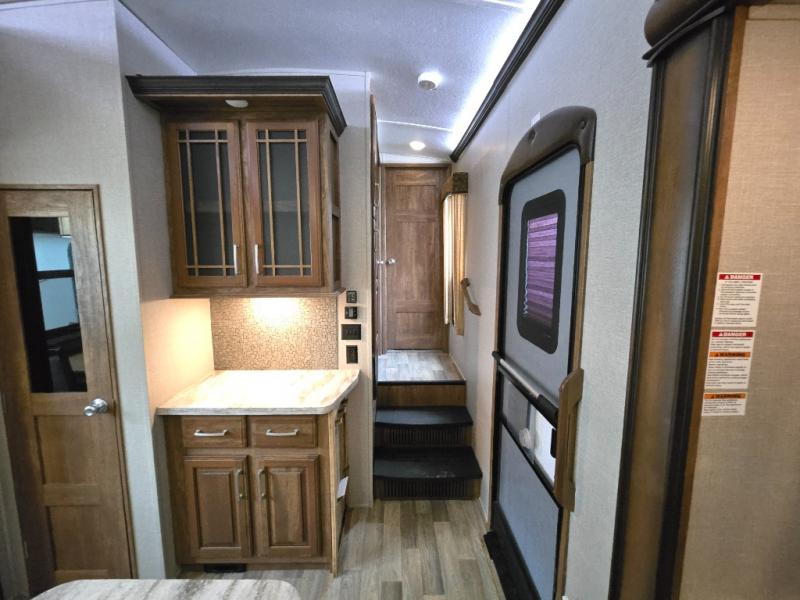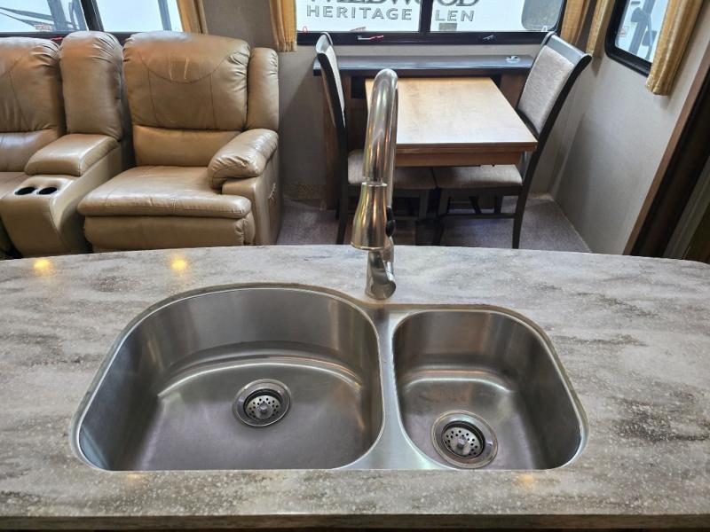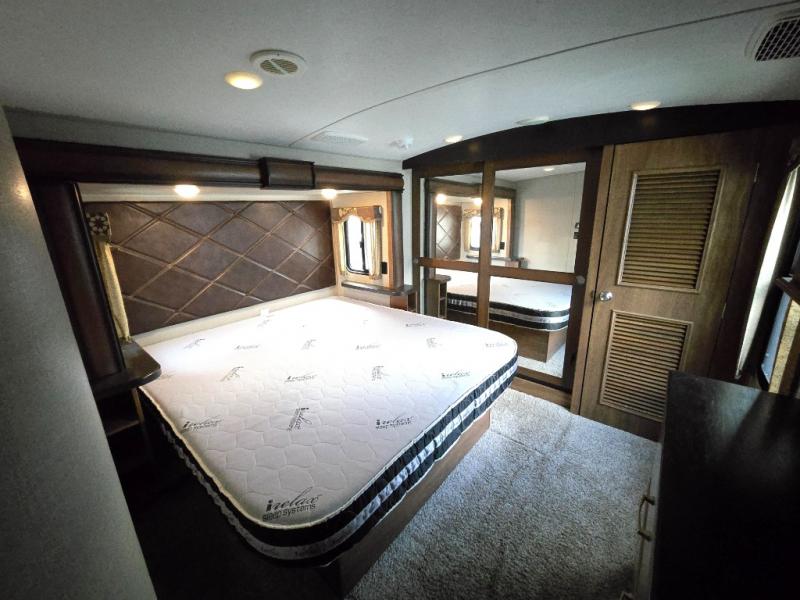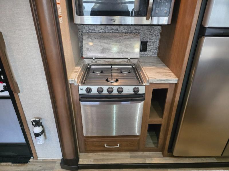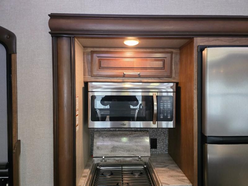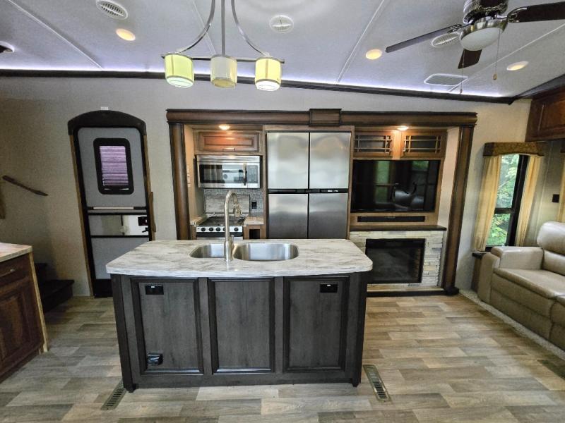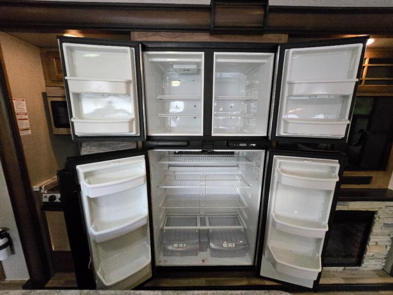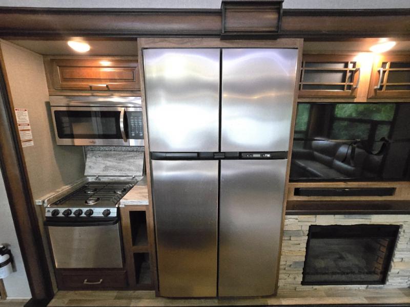 Step inside and see a spacious gathering place to the left of the door. There are dual slides that offer increased floor space giving you an at-home feel. There is a three burner range with convection microwave oven, a double door refrigerator, and an entertainment center with HDTV and fireplace in the slide out to the left of the entry door. You will also find a convenient kitchen island that offers counter food prep space and double sinks for cleaning up. The overhead cabinets, and lower cupboards and drawers will make storing your dishes easy too.