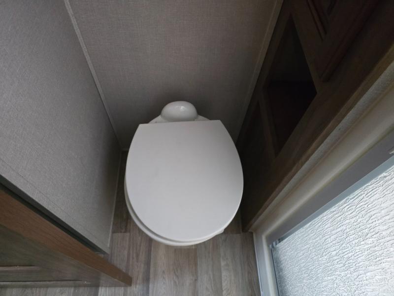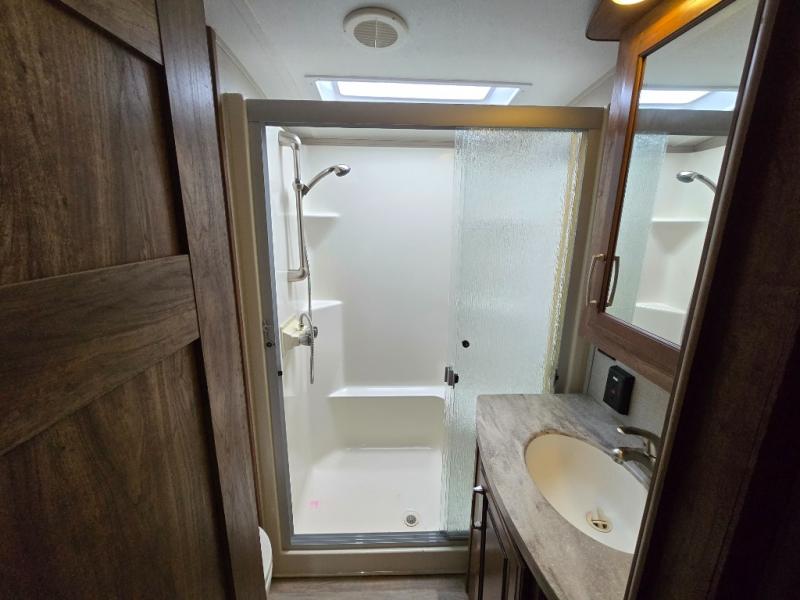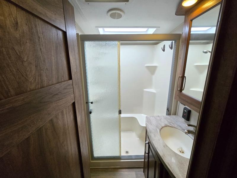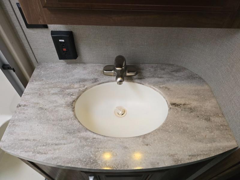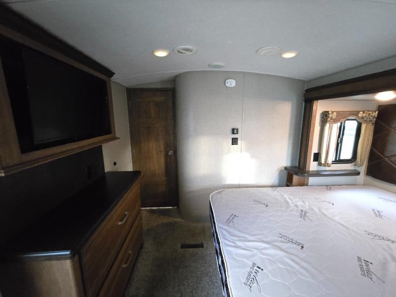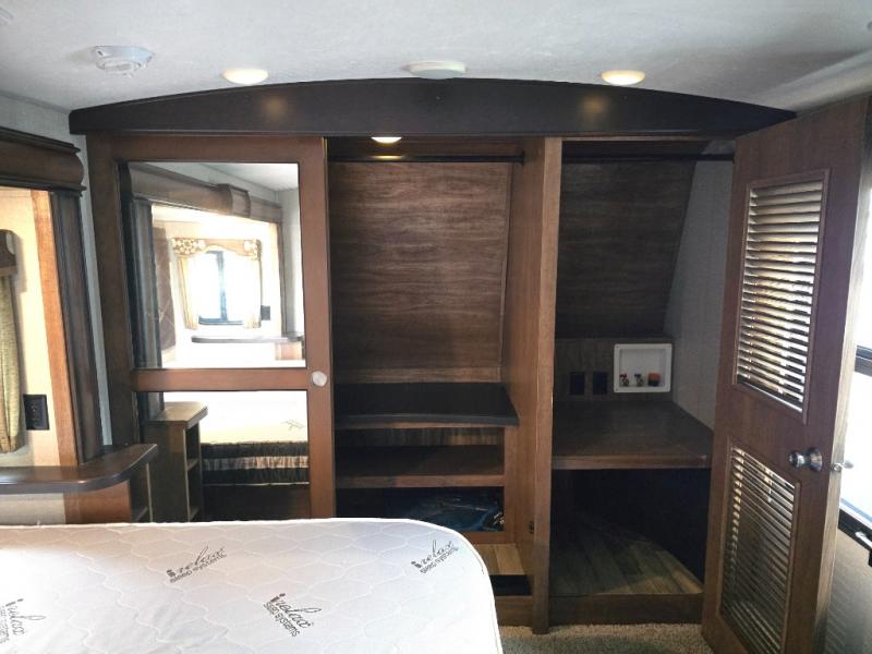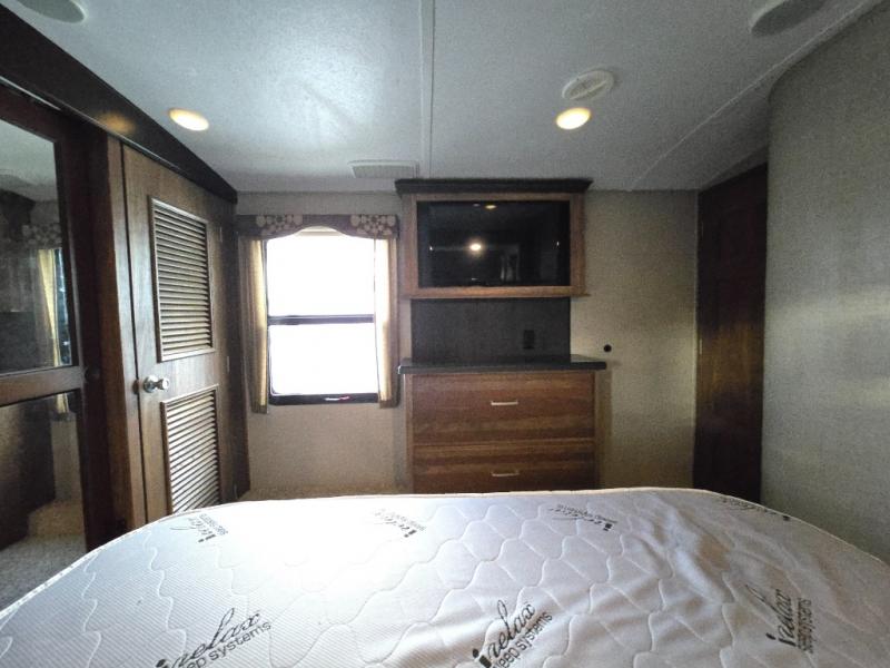 The front master bedroom provides ample space and a comfortable queen or optional king bed slide out. You will enjoy storage beneath the bed for extra things like blankets, or larger items like suitcases and things. You will also find a dresser opposite the bed with an HDTV above, plus a seating area along side. The front wall features a closet with space in the corner that has been prepped for a washer/dryer.