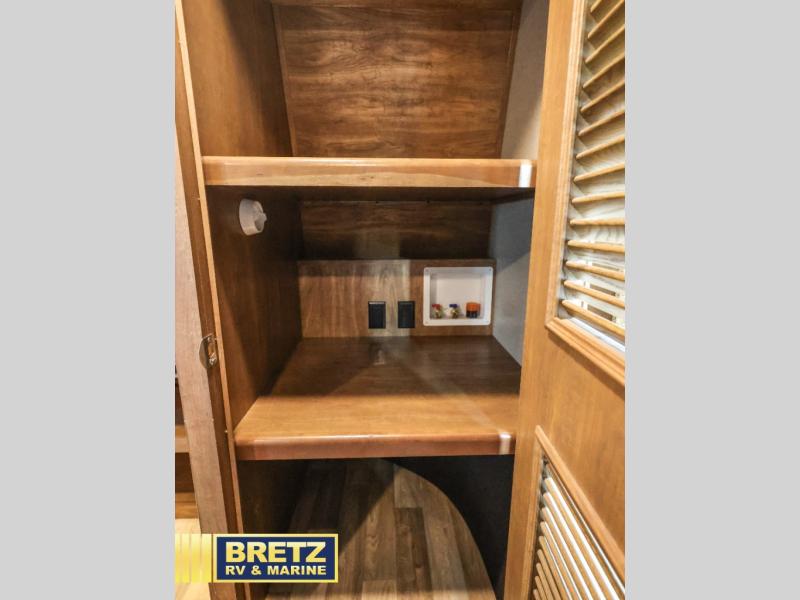 Straight in from the door along the interior living area wall there is more storage with a counter including overhead cabinets, and a pantry for dry and canned goods.