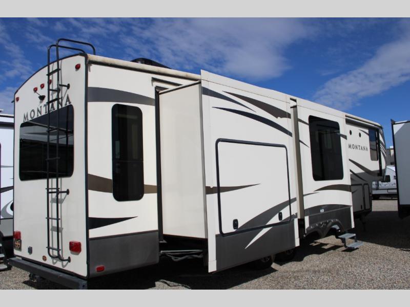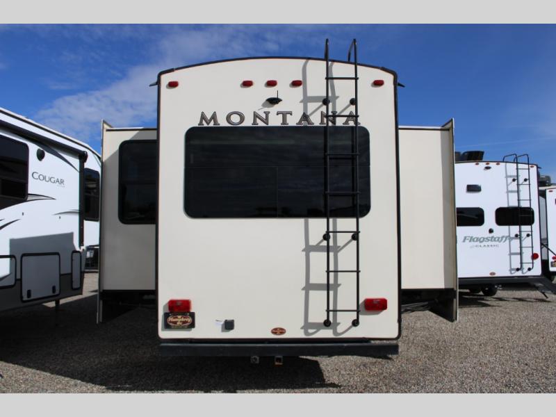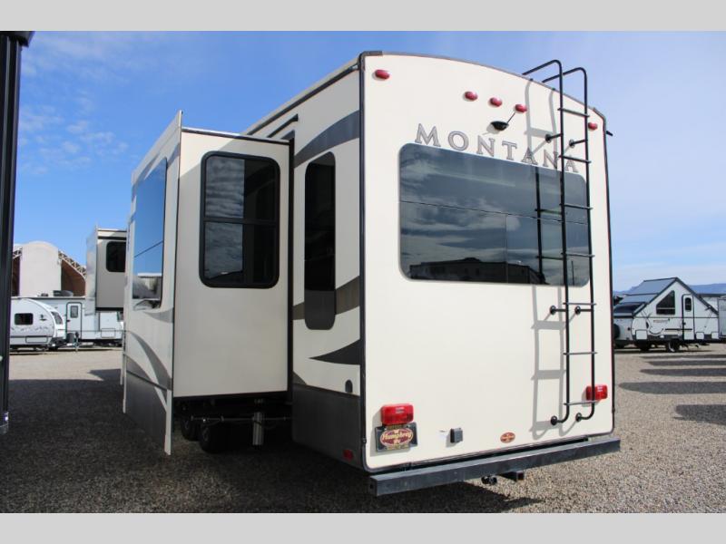 This Keystone Montana fifth wheel 3660RL offers plenty of space with FIVE slide outs, a rear living area, kitchen island, exterior entertainment center, plus much more!